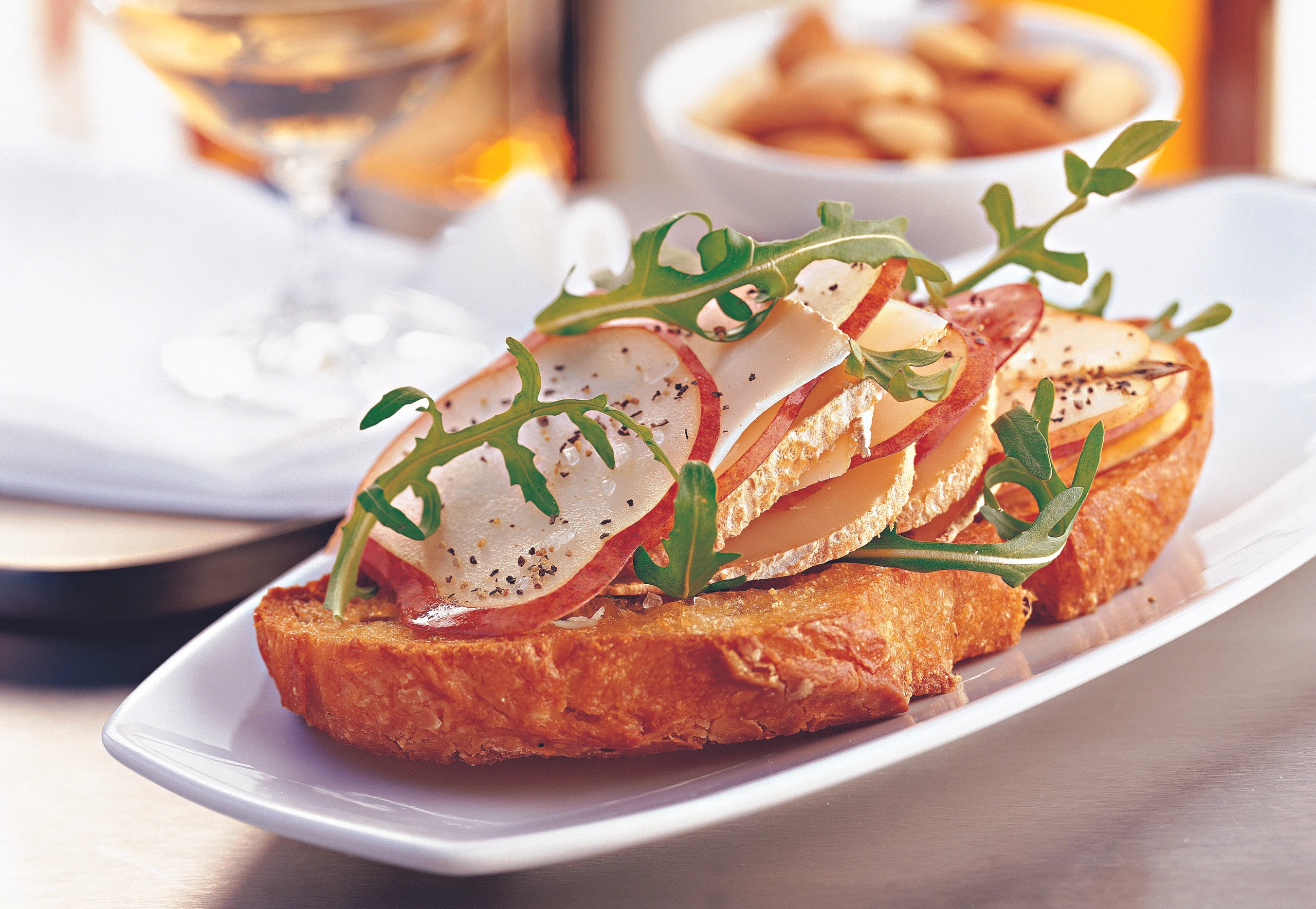 Ziegenkäse und Birnen in 4 mm dicke Scheiben schneiden. Brotscheiben abwechselnd mit Rucola, Käse- und Birnenscheiben belegen, mit Salz und Pfeffer bestreuen.