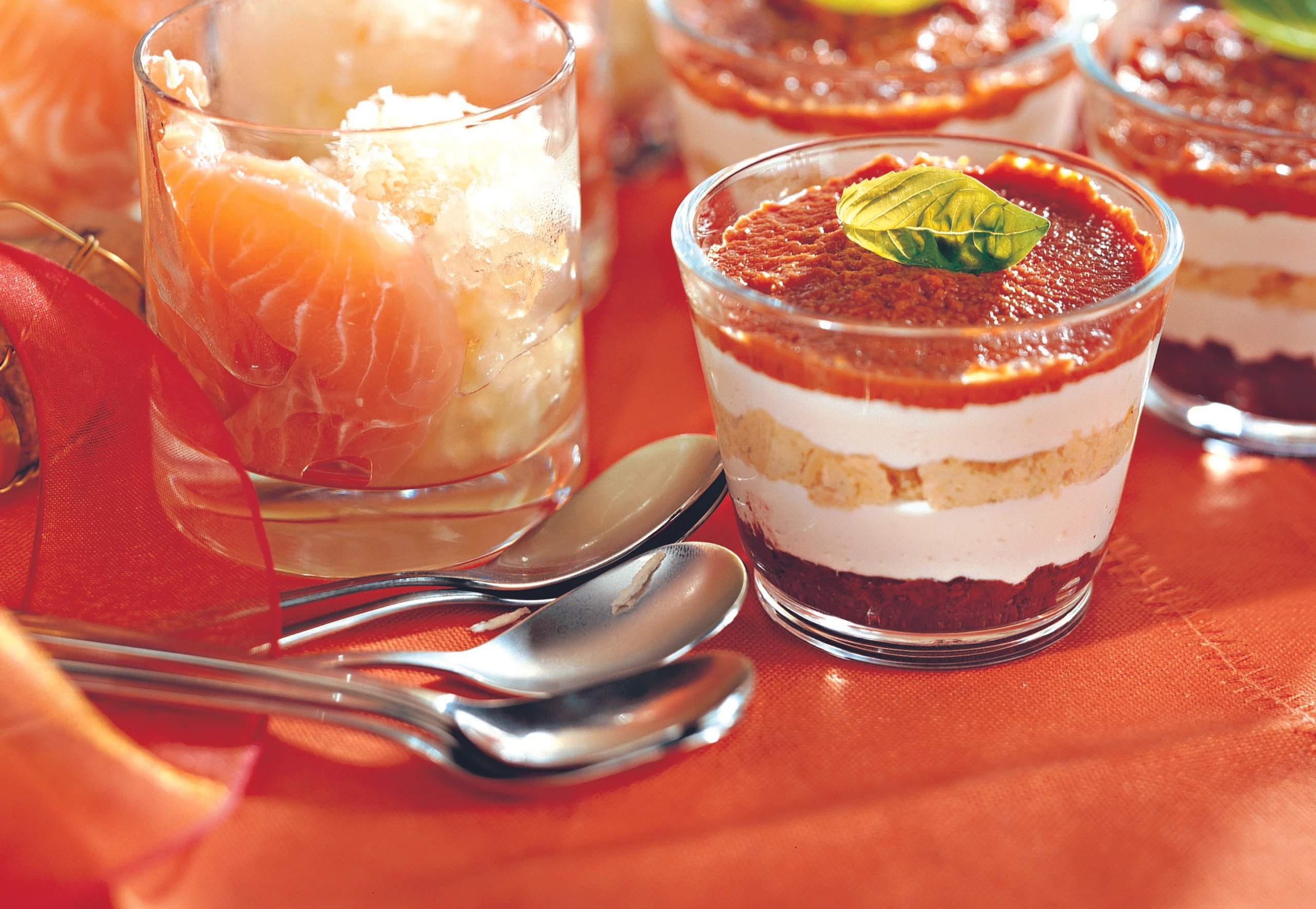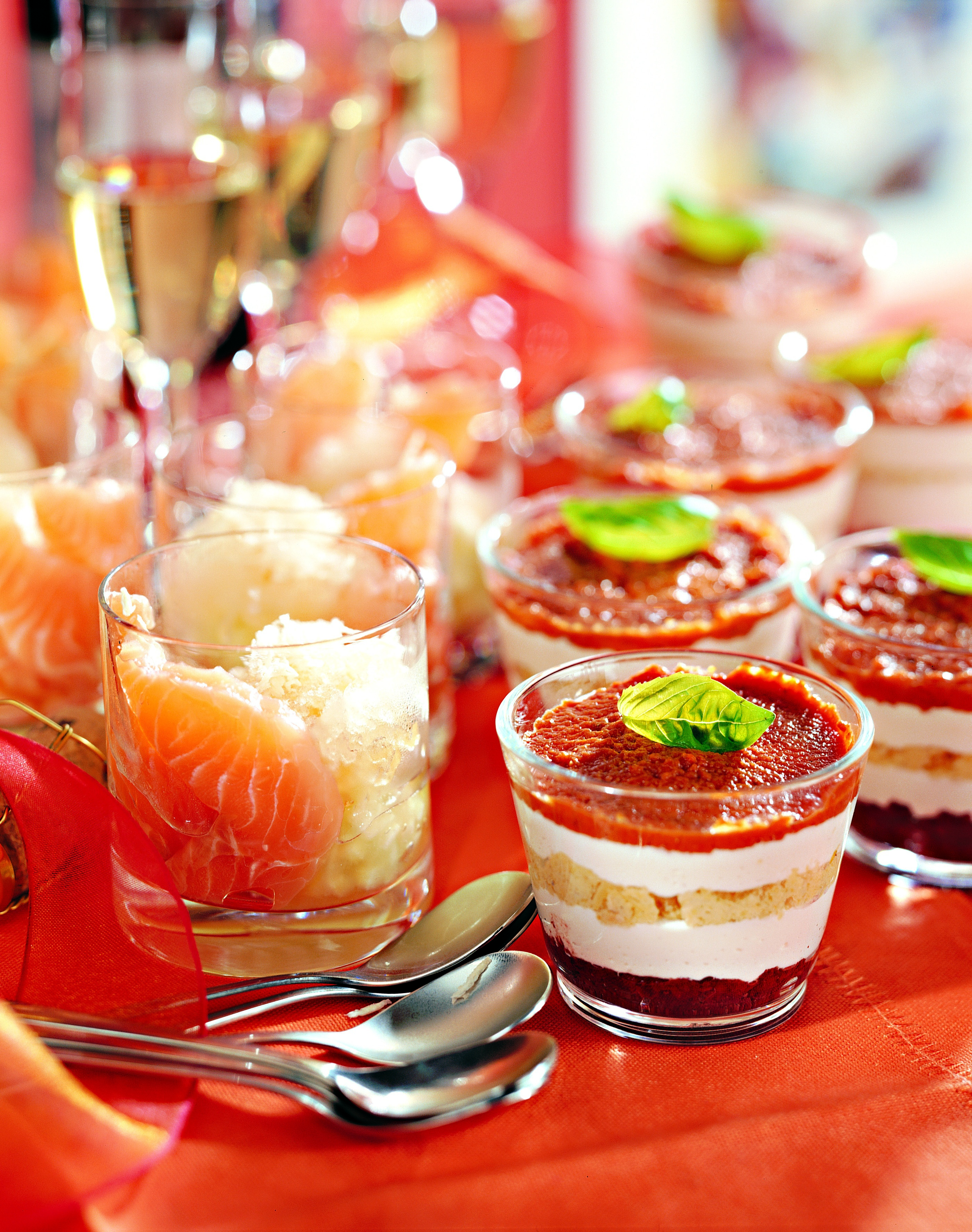 - Olivenpaste in den Gläsern verteilen, darauf die Hälfte vom Käsemousse dressieren. Artischockenpüree und das übrige Käsemousse einfüllen, mit Paradeisermasse abschließen und mit Basilikum garnieren.