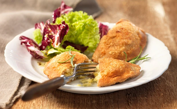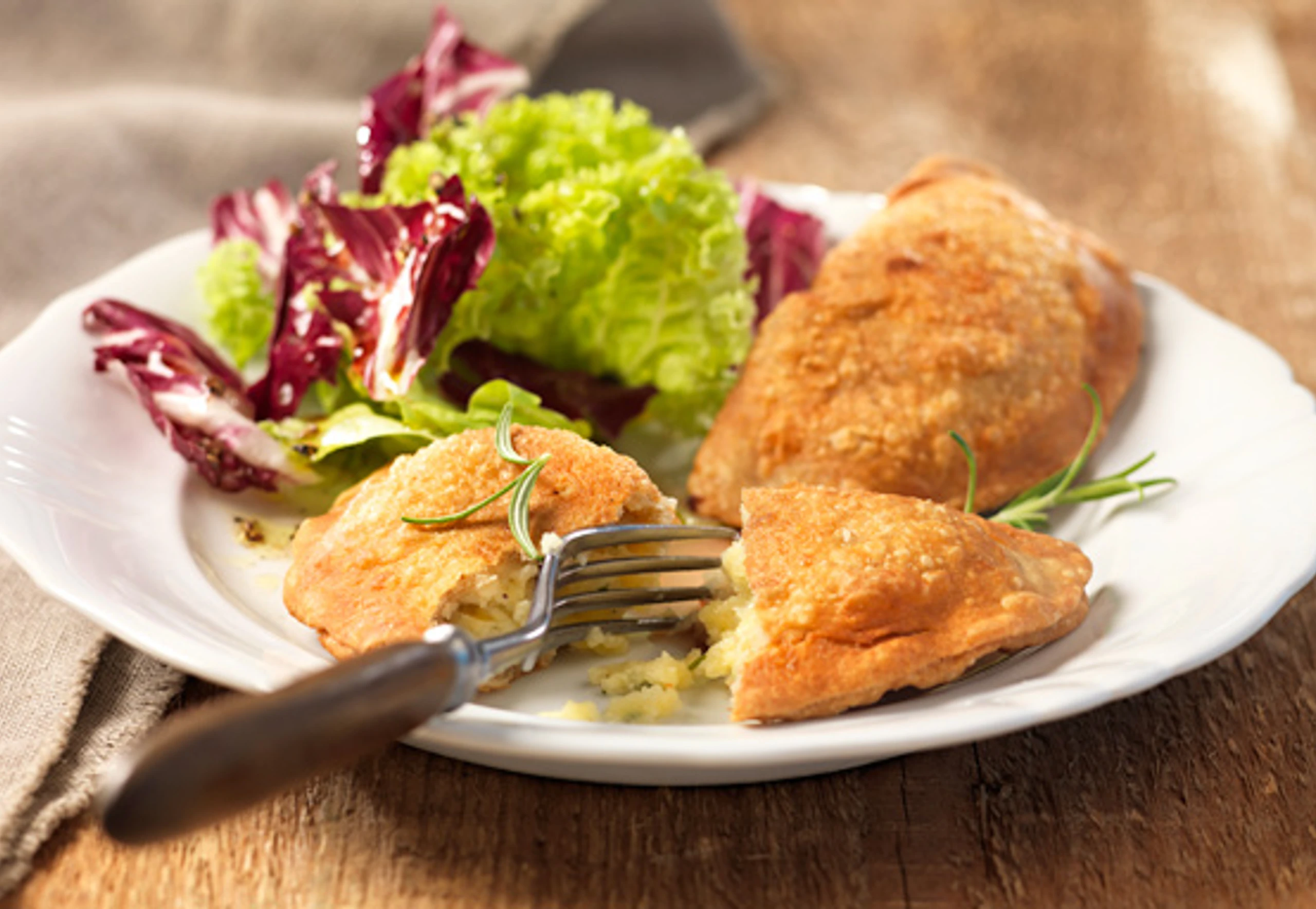 - Auf jede Teigscheibe ca. 1 EL Fülle setzen, Teig über die Mitte zusammenklappen. Teigränder festdrücken. Butterschmalz erhitzen, Krapfen darin goldbraun backen. Auf Küchenpapier abtropfen lassen; mit Salat servieren.