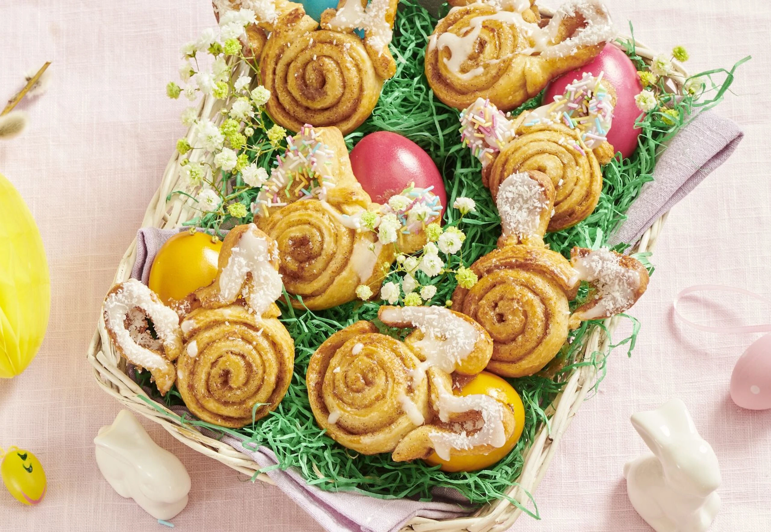 Für die Ohren 8 ca. 1 cm breite Streifen vom Teig (kurze Seite) abschneiden. Übrigen Teig von unten nach oben eng einrollen. In 12 Stücke schneiden.