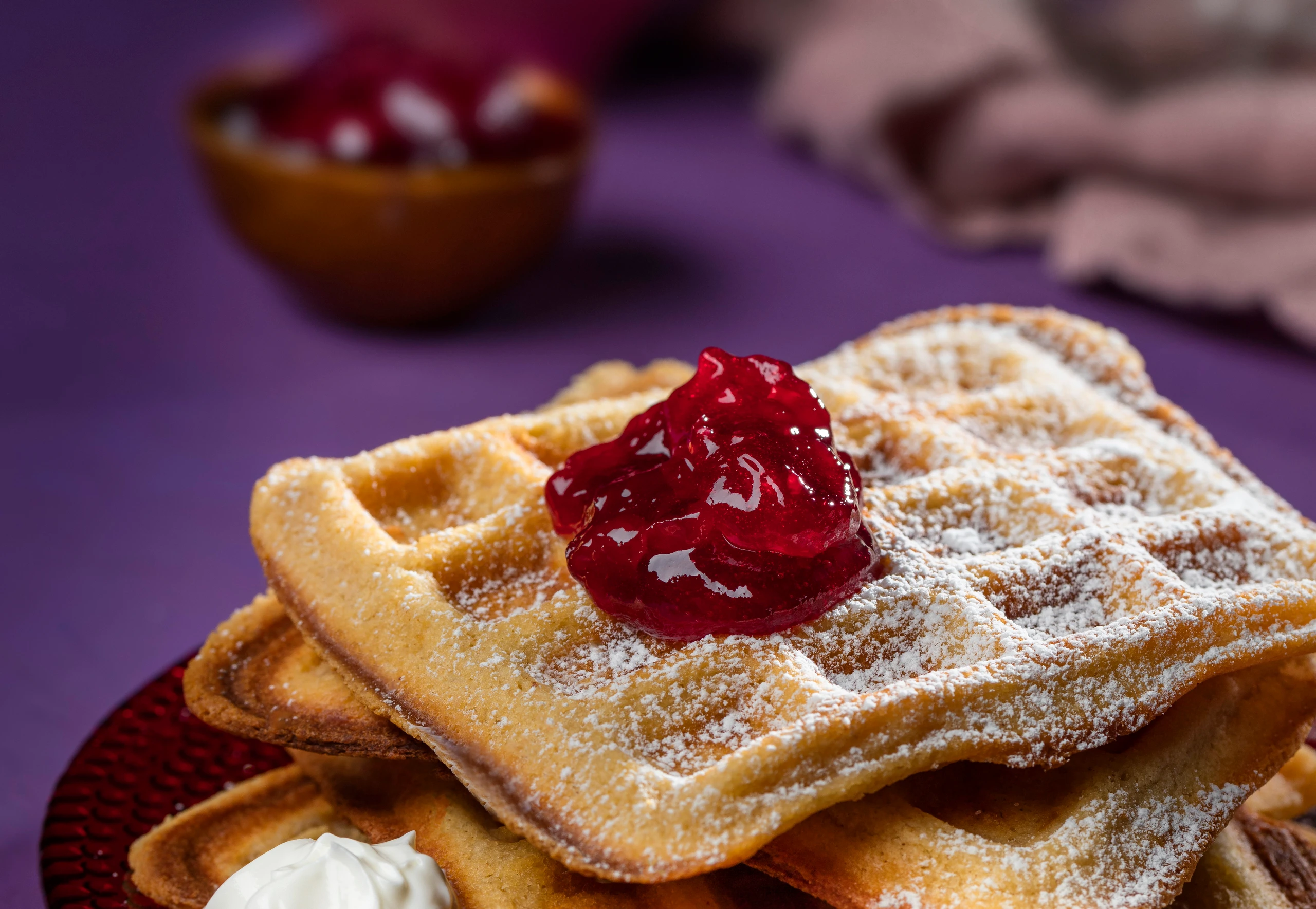 Waffeln mit Staubzucker bestreuen, mit Marmelade und Rahm servieren.