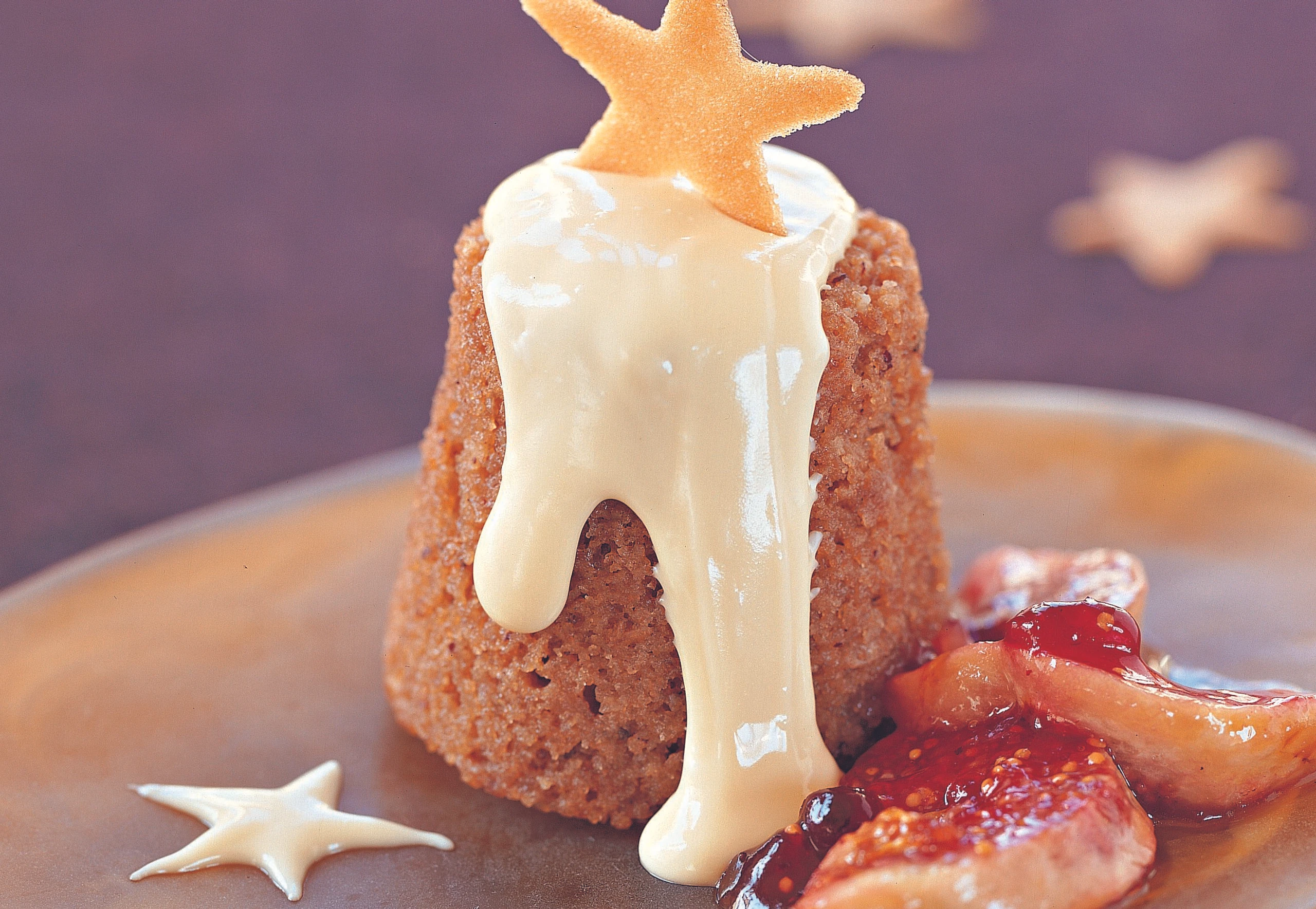 Zimtauflauf mit Preiselbeerfeigen und weißer Schokosauce