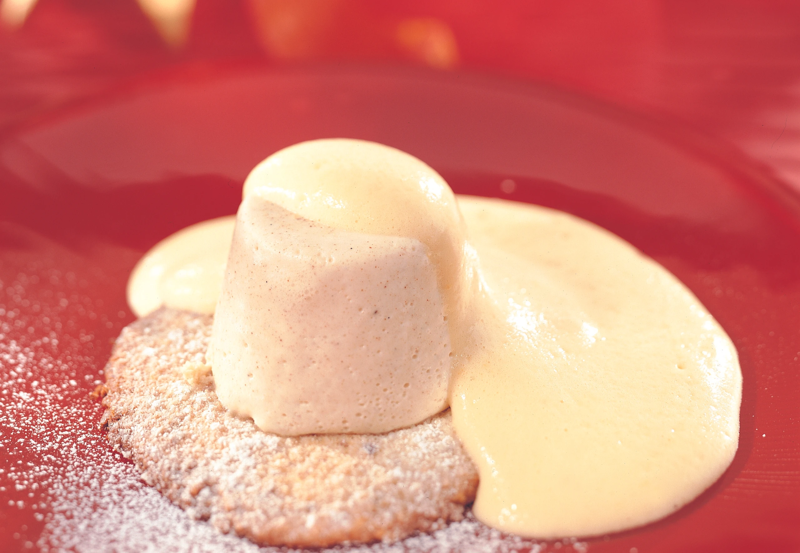 Förmchen kurz in heißes Wasser tauchen, Creme aus den Förmchen stürzen und auf die Cookies setzen. Mit dem Sabayon servieren.