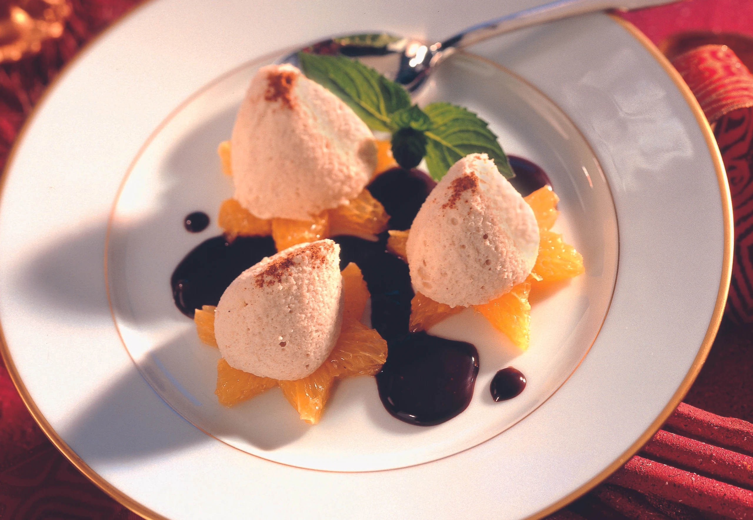 Mit einem Löffel Nockerln aus der Masse ausstechen, auf die marinierten Orangensterne setzen und mit Schokoladesauce, Minzblättern und gemahlenem Zimt garnieren.