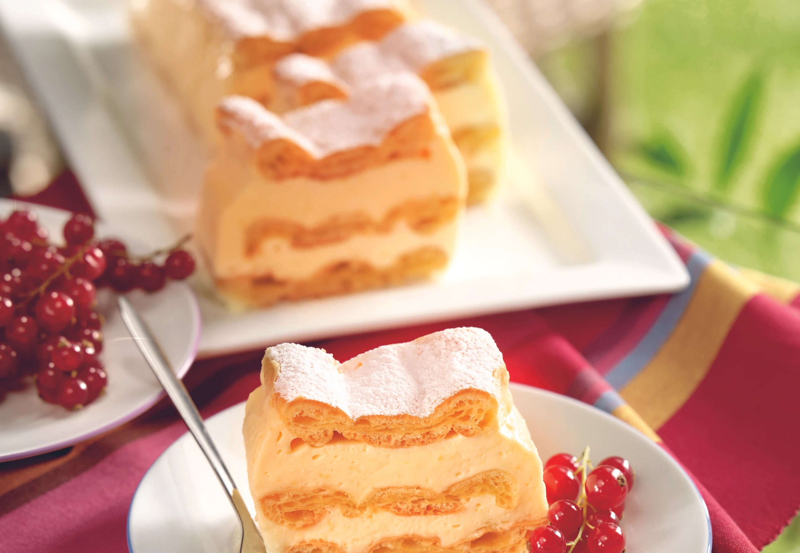 Einen Teigboden mit einem Kuchenrahmen umstellen und mit der Hälfte der Creme bestreichen. Teigboden daraufsetzen und mit restlicher Creme bestreichen. Übrigen Teigboden darauflegen und behutsam andrücken. Schnitte mit Frischhaltefolie zudecken und für ca. 4 Stunden kühl stellen. Vor dem Servieren mit Staubzucker bestreuen und eventuell mit Ribiseln garnieren.