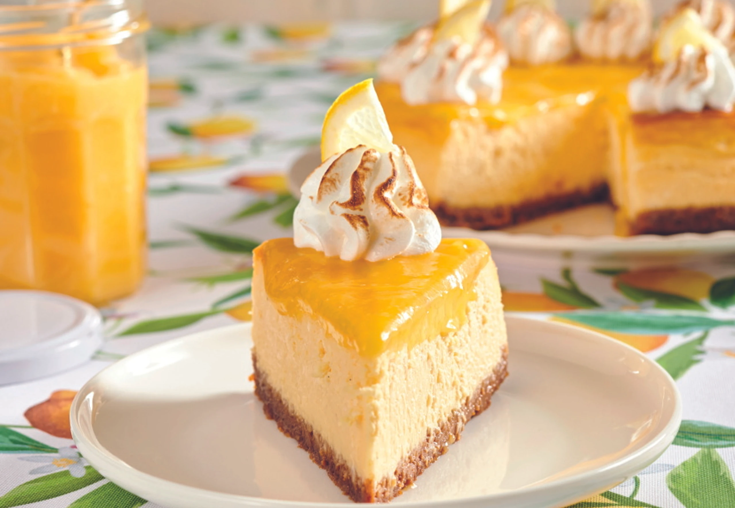 Für die Deko Eiklar und Zucker zu steifem Schnee schlagen und in einen Dressiersack mit Lochtülle füllen. Cheesecake damit verzieren. SchneeTupfer mit einem Bunsenbrenner abflämmen. Zitronenscheiben vierteln und den Kuchen damit dekorieren.
