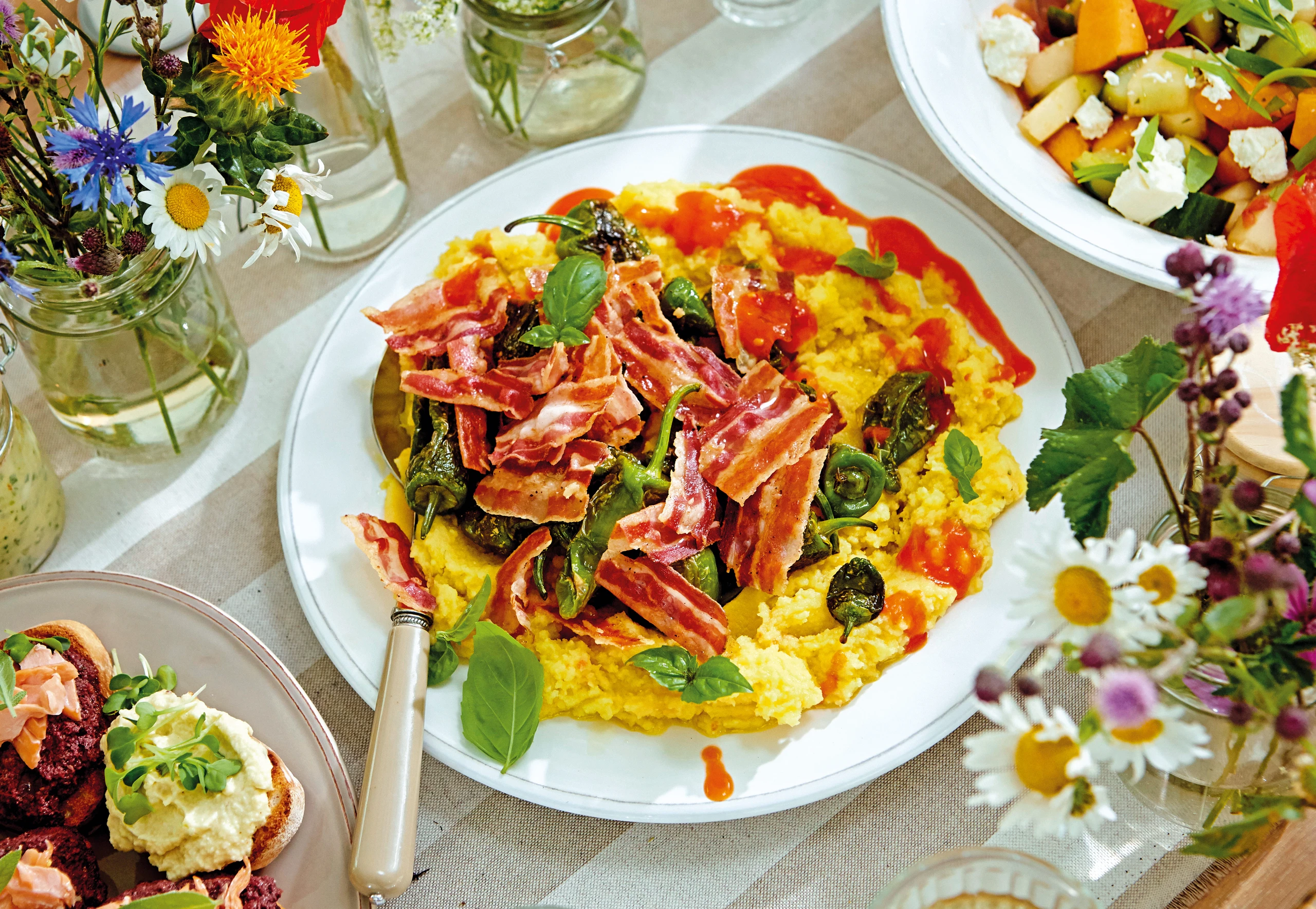 Zitronen-Erdäpfelpüree mit Pimentos und Pancetta