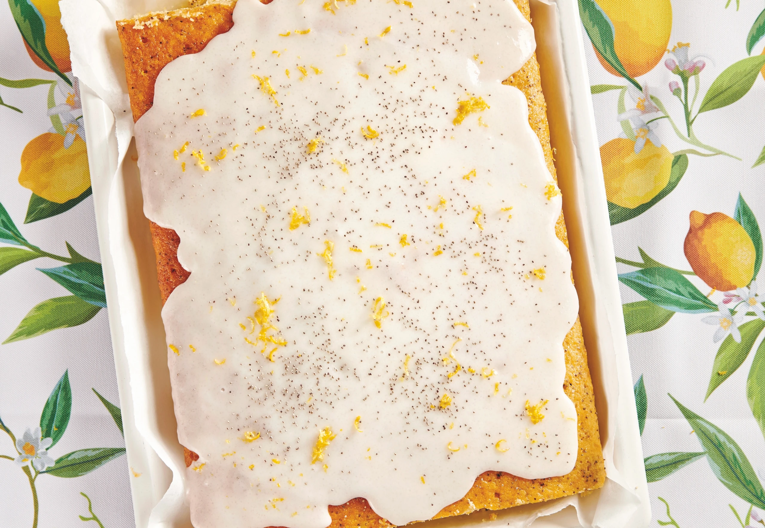 Für die Glasur Staubzucker und Zitronensaft glatt rühren und auf dem Kuchen verstreichen. Mit Mohn und Zitronensachale bestreuen.