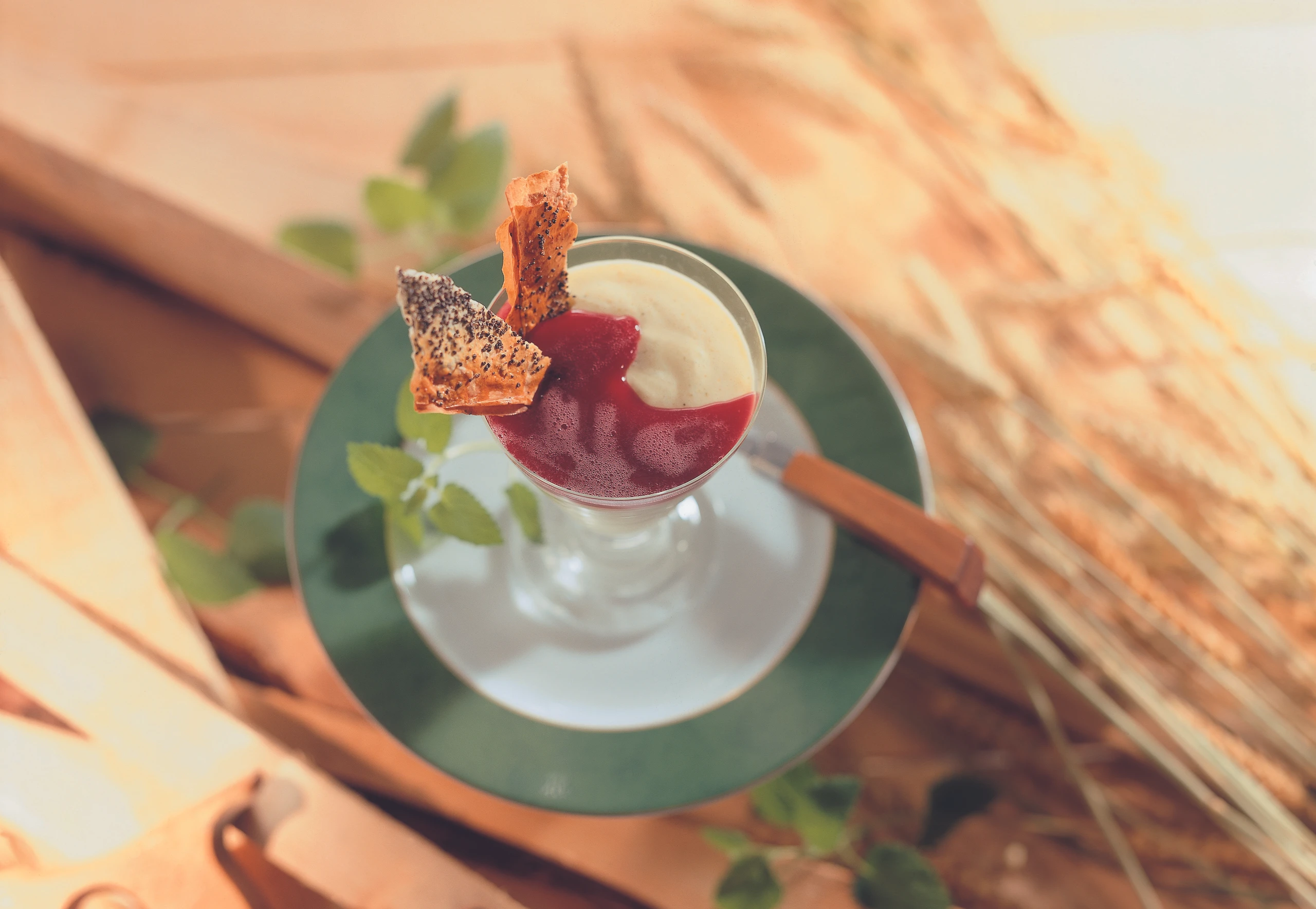 Mus aus dem Kühlschrank nehmen und die Folie entfernen. Flüssiges Johannisbeergelee auf das Mus gießen und fest werden lassen. Dessert mit Minze garniert servieren.
