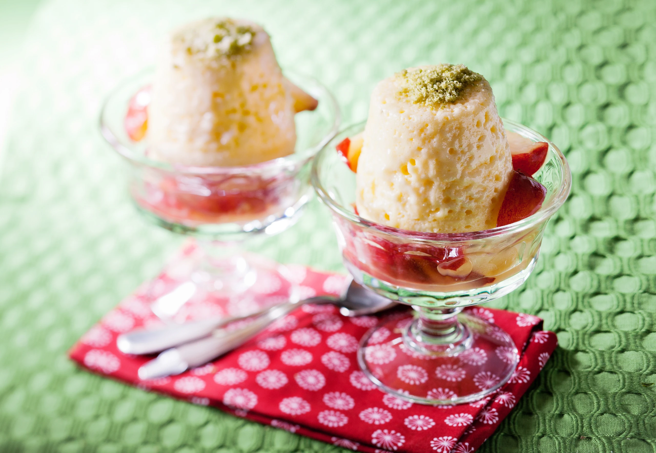 Förmchen mit der Masse füllen, in eine feuerfeste Form stellen und so viel kochendes Wasser zugießen, dass sie zur Hälfte im Wasserbad stehen. Aufläufe im Rohr (untere Schiene / Gitterrost) ca. 20 Minuten garen. Aufläufe auf Teller stürzen, mit den Pfirsichspalten anrichten und mit Minzezucker bestreut servieren.