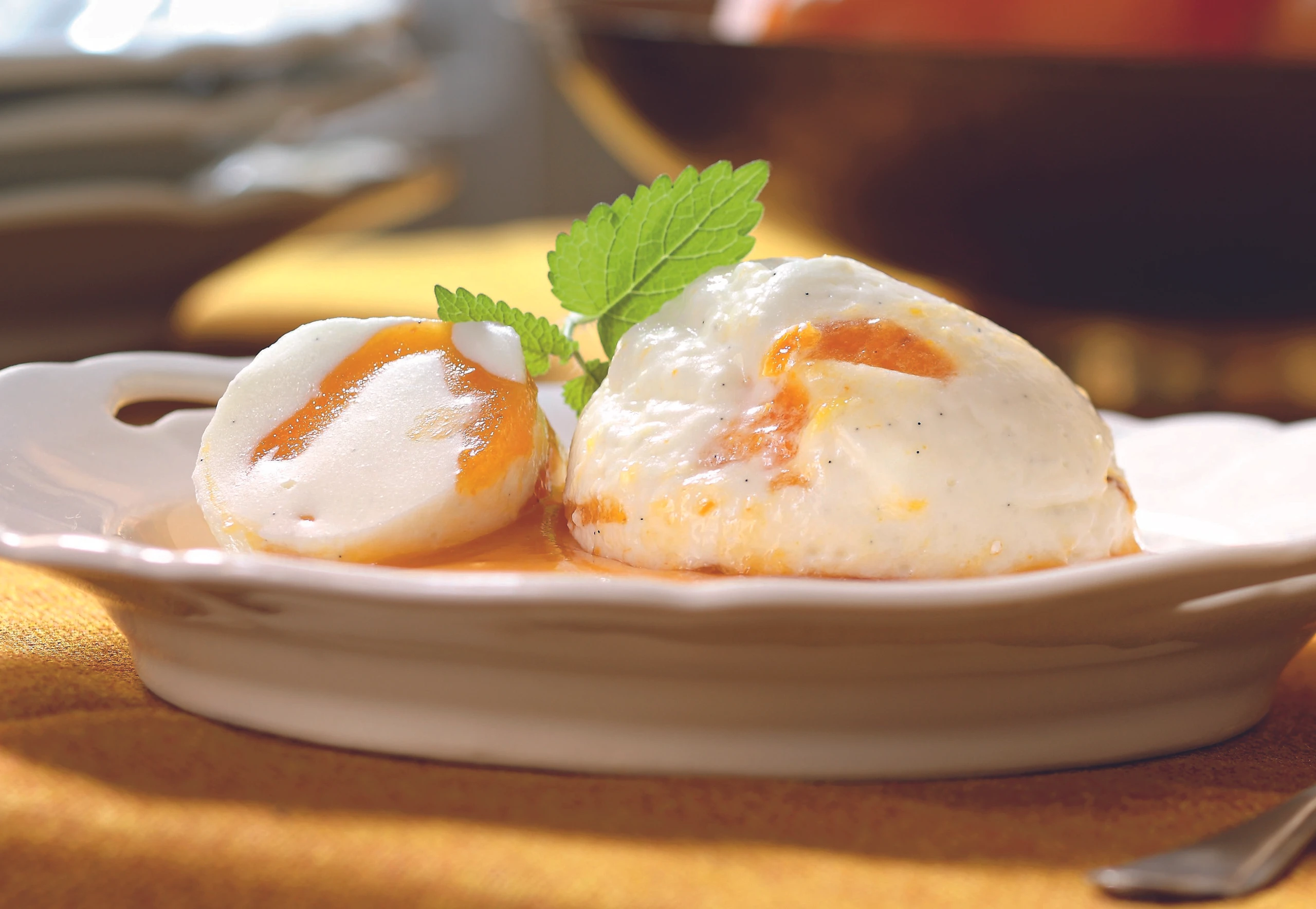 Für die Kakis Gelatine in kaltem Wasser einweichen. Kakis grob schneiden. Kristallzucker in einer Pfanne schmelzen. Kakis zugeben, schwenken und anschließend fein pürieren. 4 EL Kakipüree beiseite stellen. Ausgedrückte Gelatine in der heißen Kakimasse auflösen und kalt rühren.