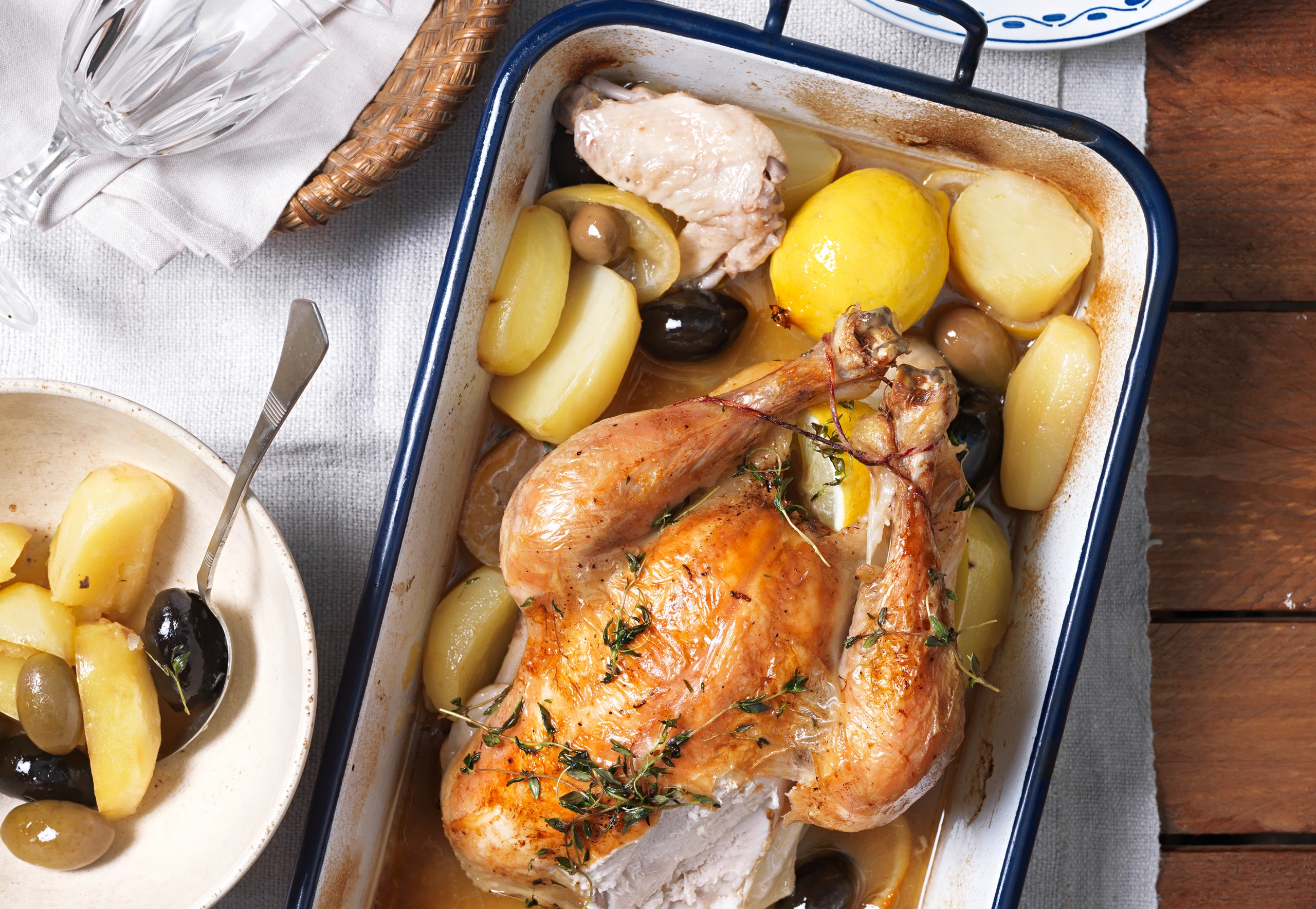 Huhn in eine Bratpfanne mit hitzebeständigen Griffen setzen und mit Zitronensaft und Öl übergießen. Erdäpfel und Zitronenscheiben zugeben und mit Salz und Pfeffer würzen. Suppe zugießen, Huhn ins Rohr schieben (untere Schiene / Gitterrost) und ca. 30 Minuten braten. Temperatur auf 180°C reduzieren, Oliven zugeben und das Huhn noch 1 Stunde garen. Währenddessen immer wieder mit Suppe und entstehendem Bratensaft übergießen.
