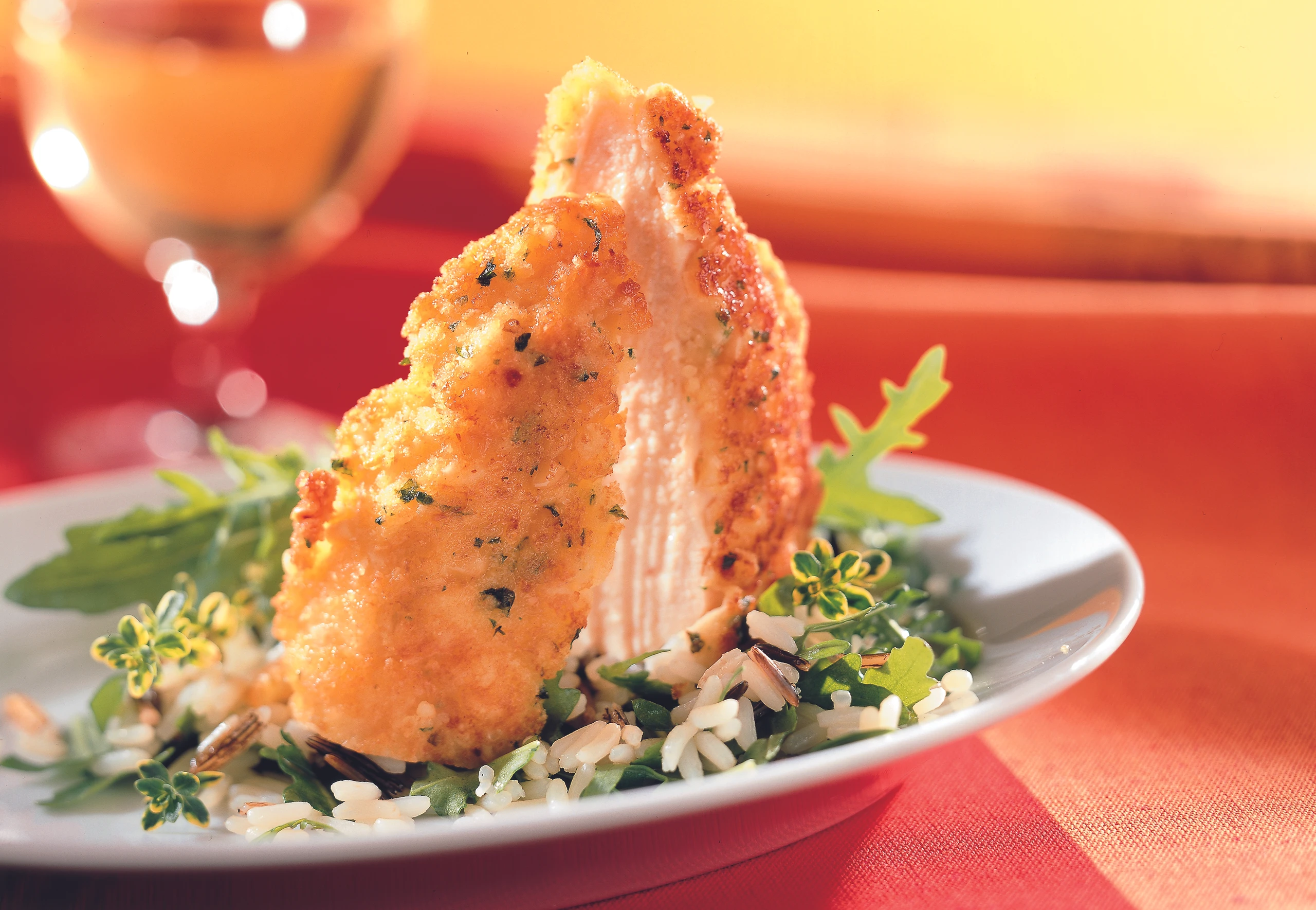 Zitronenhuhn mit Parmesankruste und Rucola-Reis
