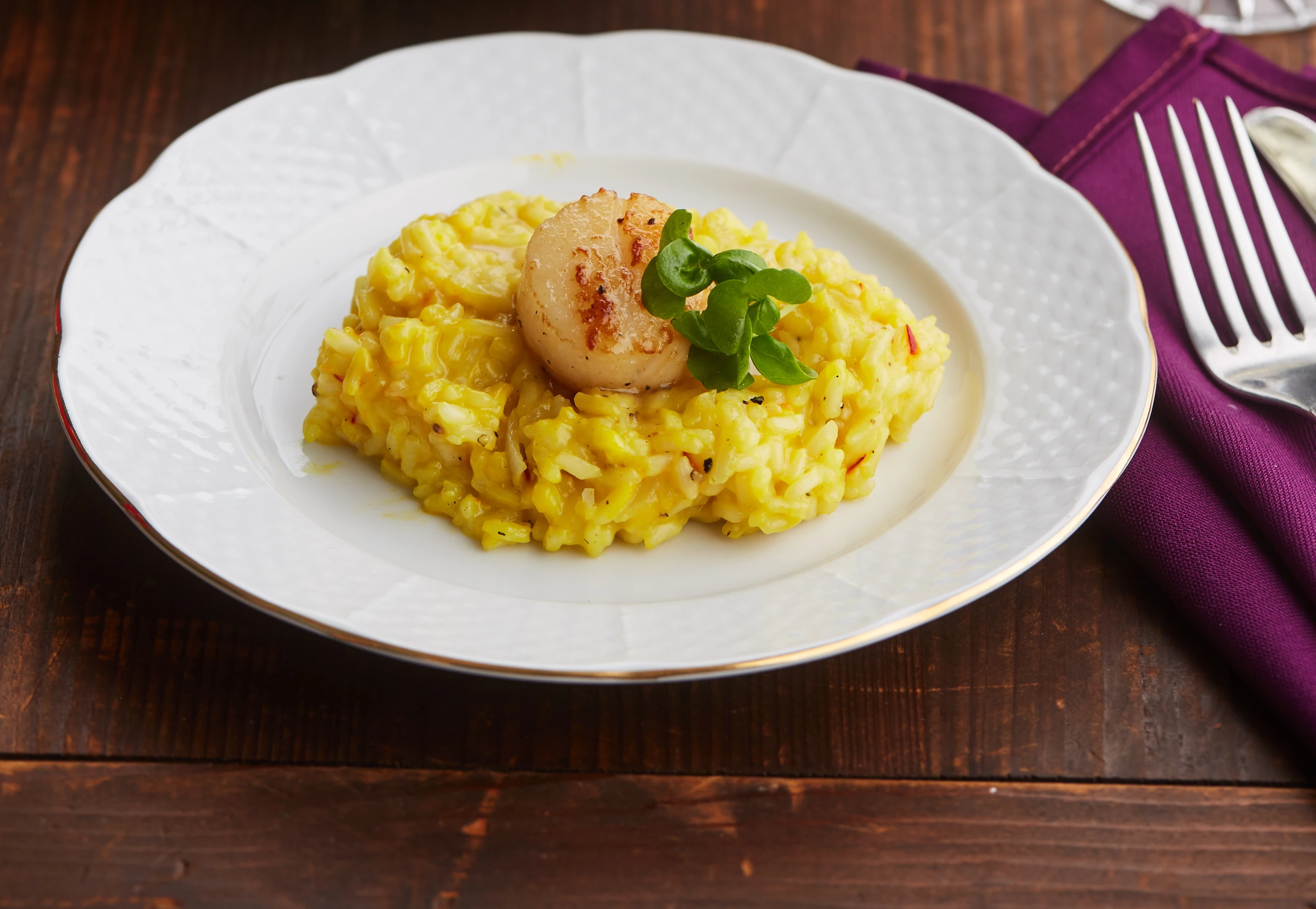 Kresseblättchen von den Stielen schneiden. Öl erhitzen, Jakobsmuscheln salzen und darin beidseitig braten. Risotto mit Jakobsmuscheln anrichten und mit Kresse garniert servieren.