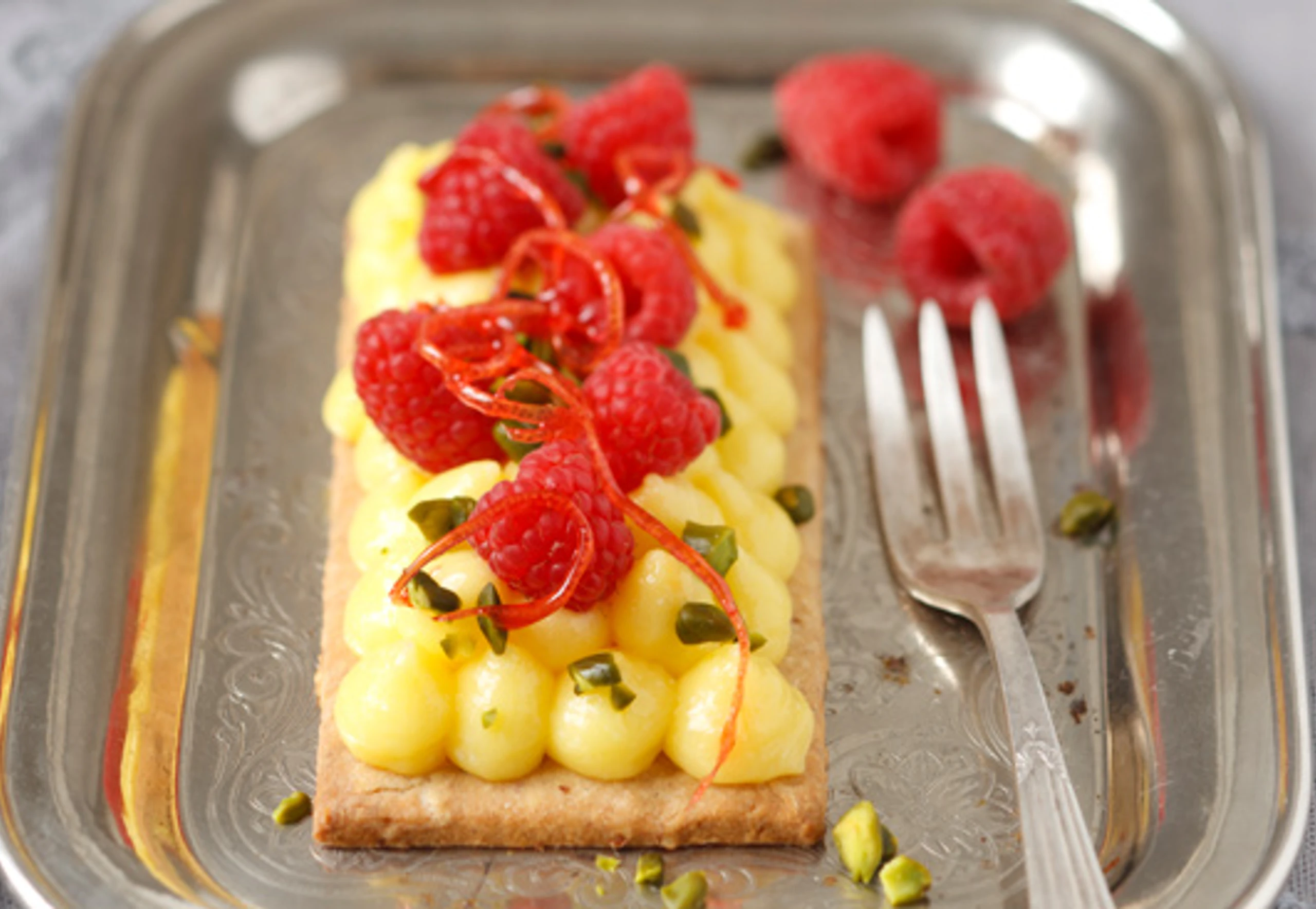- Zitronencreme in einen Dressiersack (glatte Tülle) füllen und in kleinen Tupfern auf die Teigschnitten dressieren. Schnitten mit Himbeeren, Pistazien und den Zitronenstreifen garnieren.