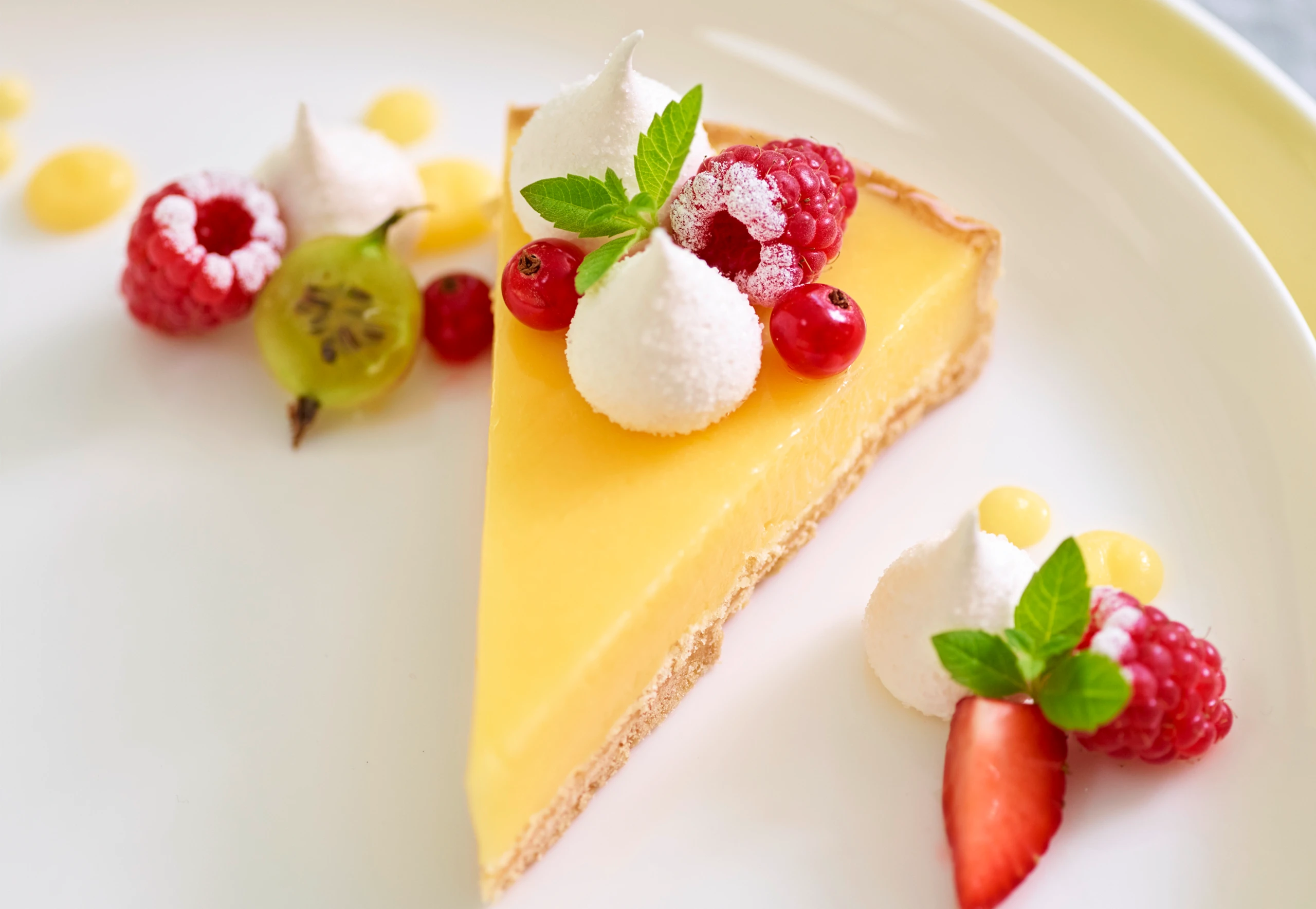 Mürbteigboden mit einem Biskuitboden belegen und die Zitronencreme darauf glatt verstreichen. Tarte zum Festwerden der Creme für ca. 4 Stunden kühl stellen. Tarte mit Beeren, Verbene, Minze und Baisers garnieren.