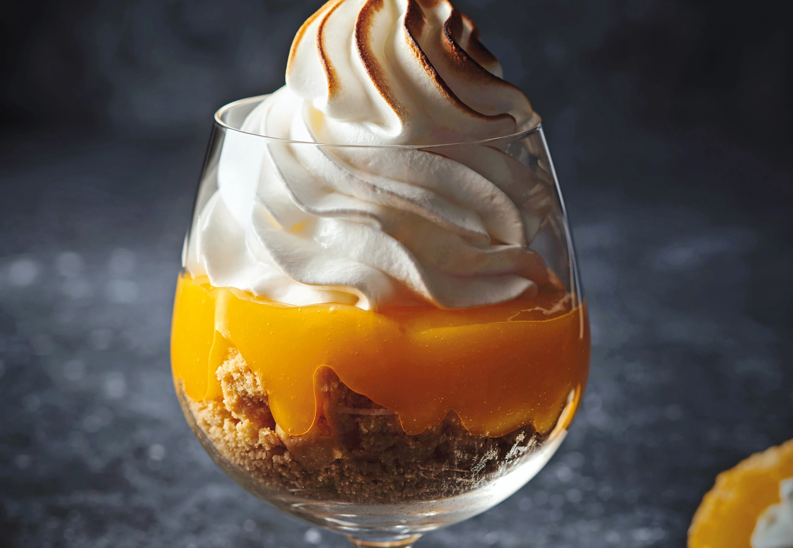 Für das Baiser Eiklar und Zucker ca. 5 Minuten zu steifem Schnee schlagen. In einen Dressiersack mit Sterntülle füllen und in die Gläser dressieren. Baiser mit einem Bunsenbrenner vorsichtig abflämmen.