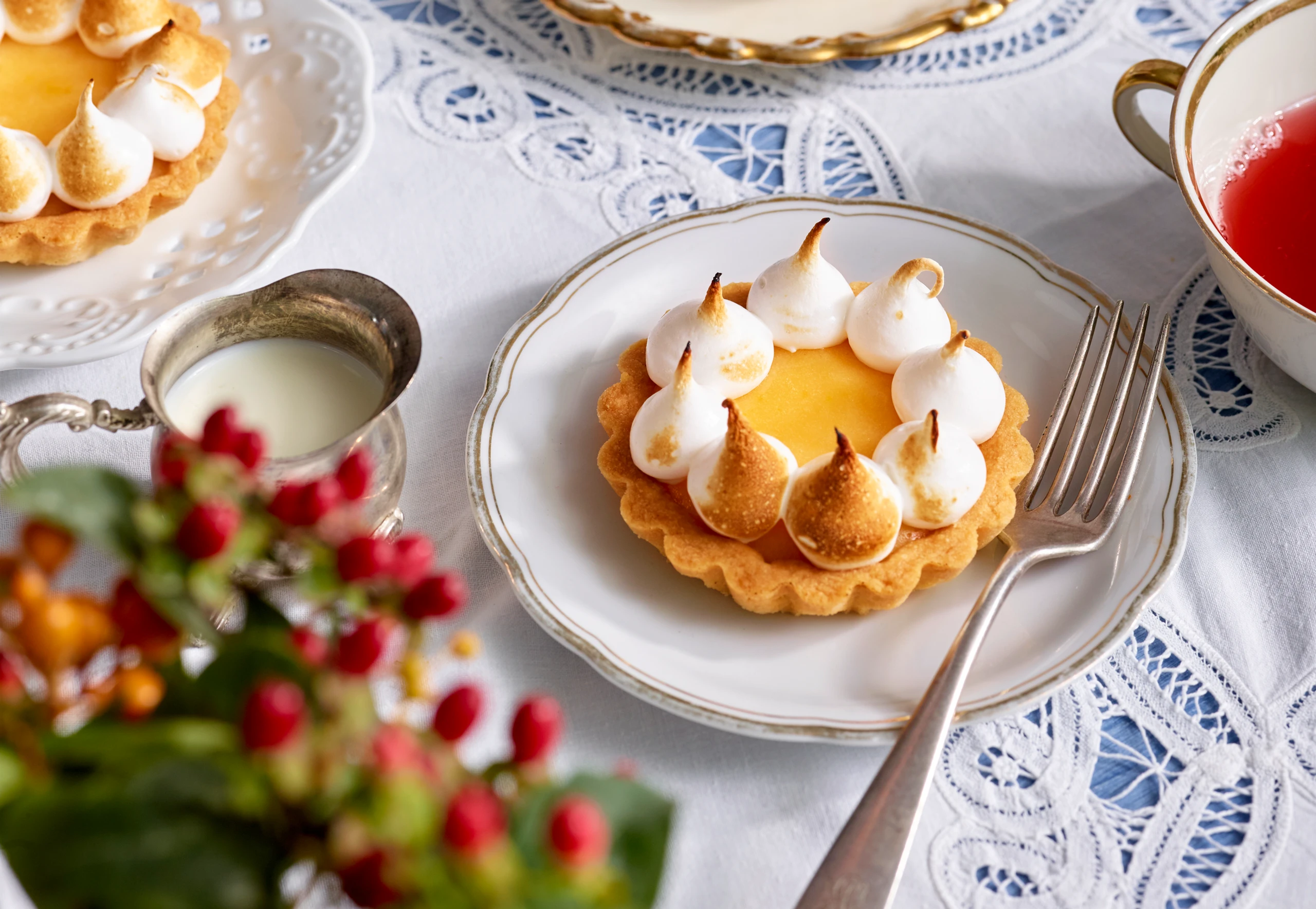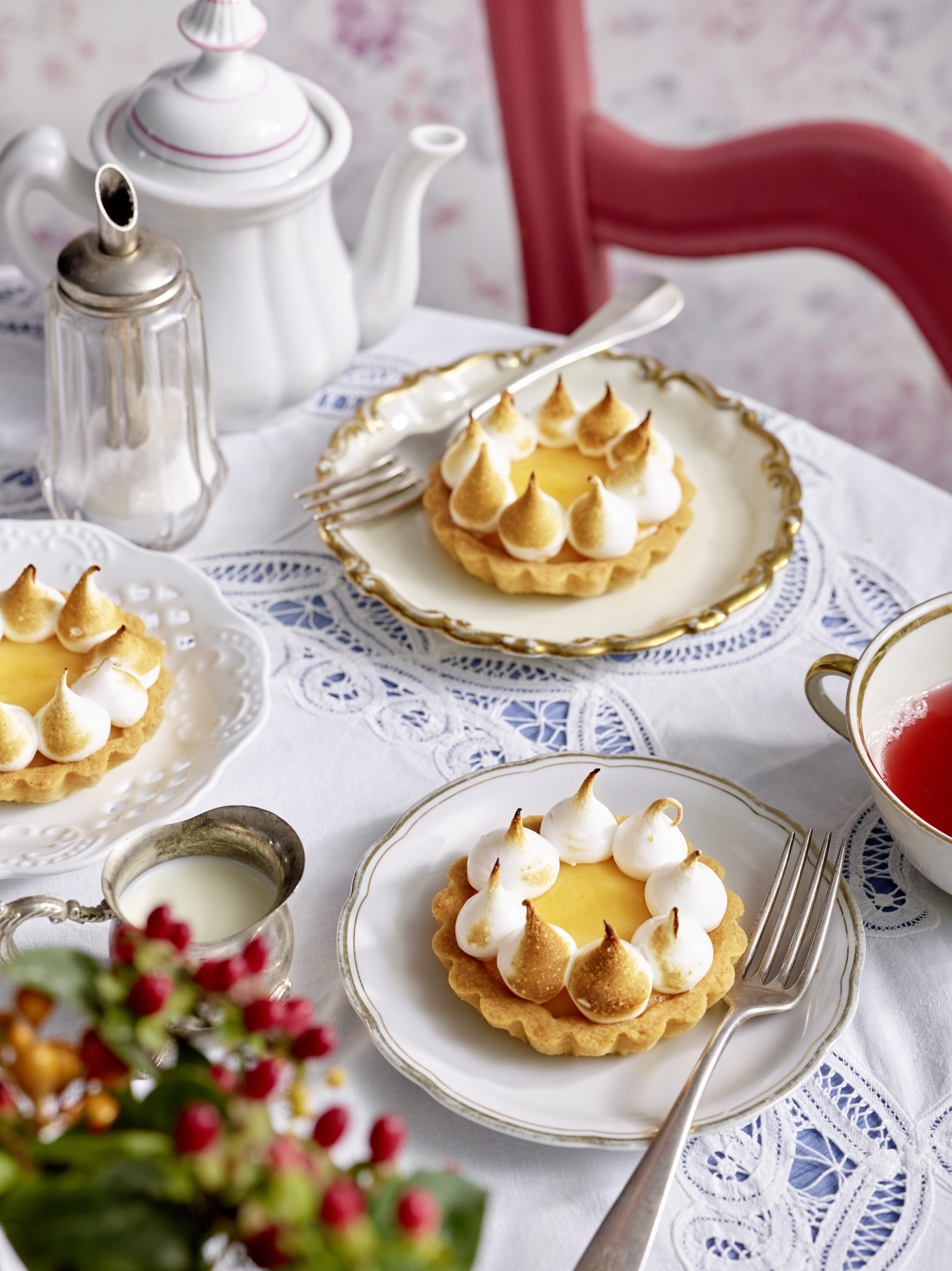 Für das Baiser Eiklar und Zucker über einem Wasserbad verrühren, bis sich der Zucker aufgelöst hat. Vom Herd nehmen und mit dem Mixer aufschlagen, bis der Schnee kalt und steif ist. Baiser in einen Dressiersack mit Lochtülle (Ø 1 cm) füllen. Den Rand der Tarteletts damit verzieren. Mit einem Bunsenbrenner abflämmen.