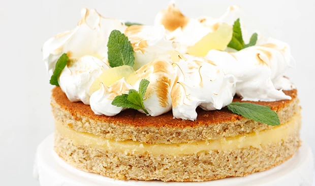 Torte aus der Form lösen, Schneemasse darauf verteilen und mit einem Flämmer bräunen. Torte mit Zitronenfilets und Minze garniert servieren.