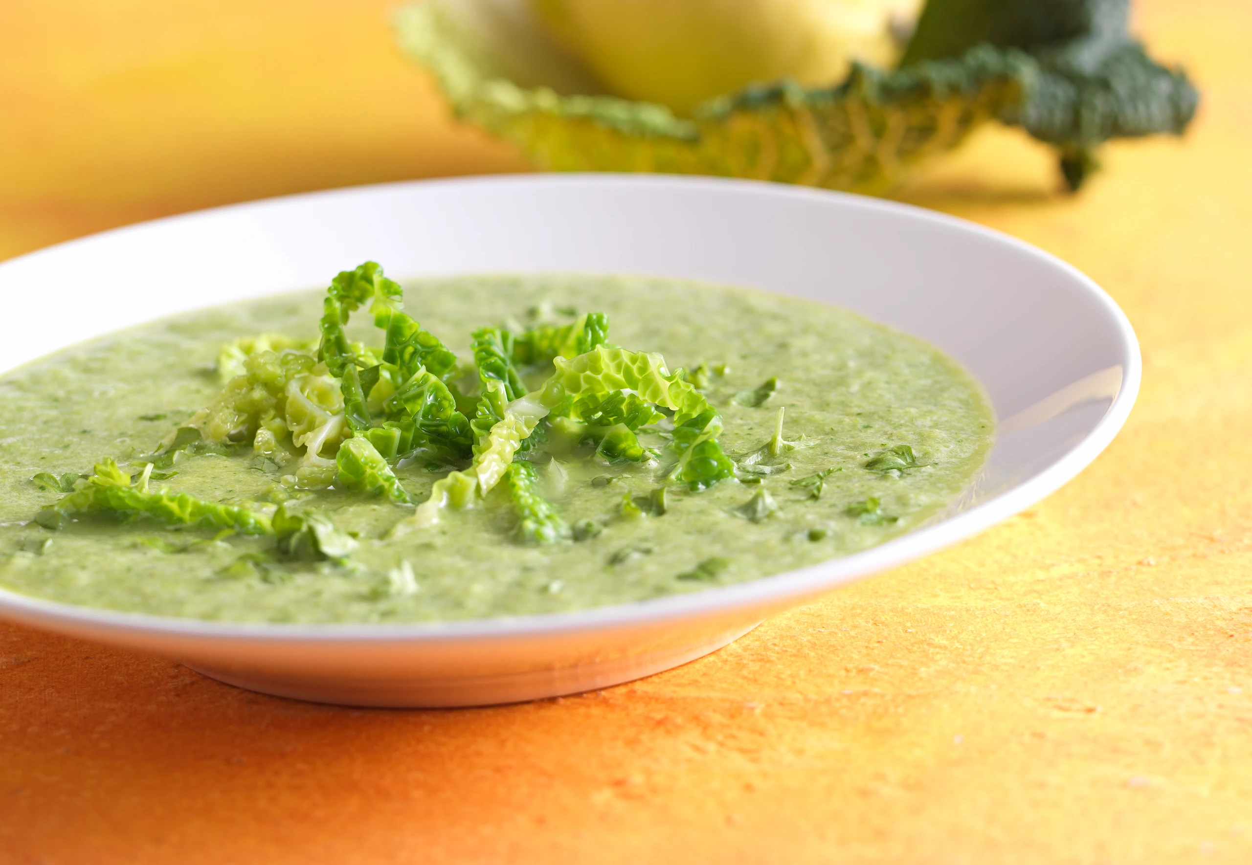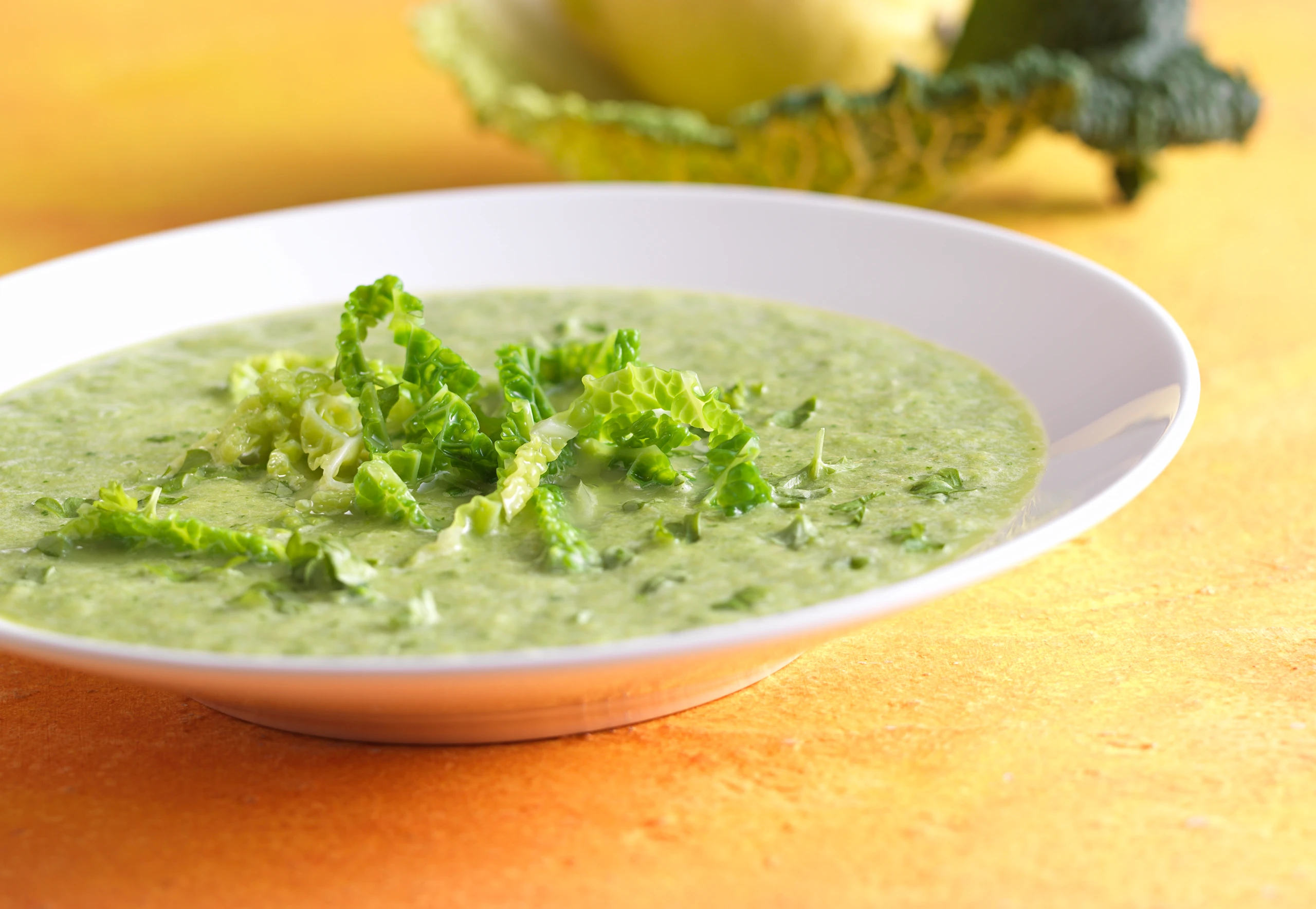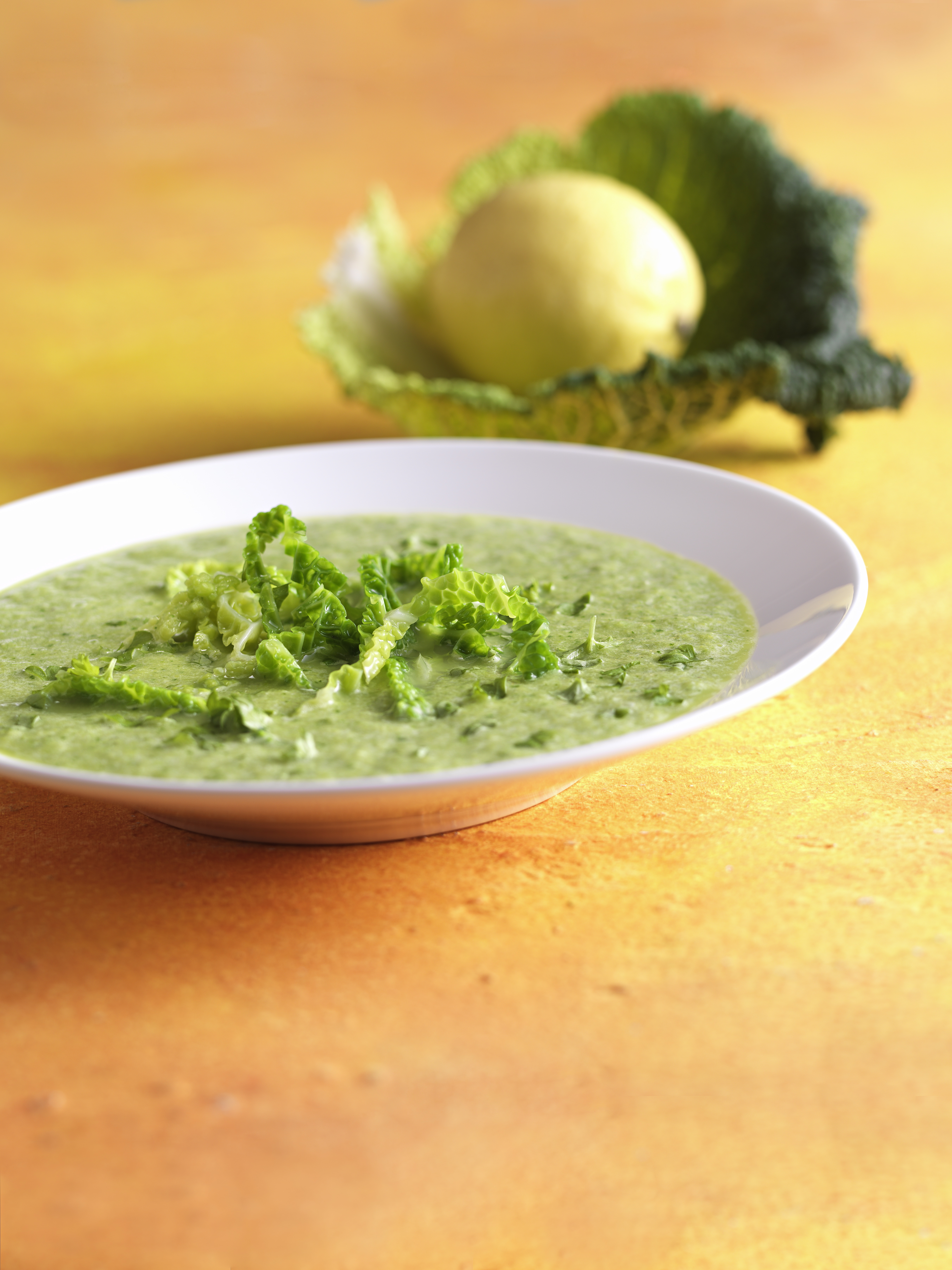 Den restlichen Kohl in Salzwasser blanchieren, abseihen und abtropfen lassen. Suppe mit den Kohlstreifen garniert servieren.