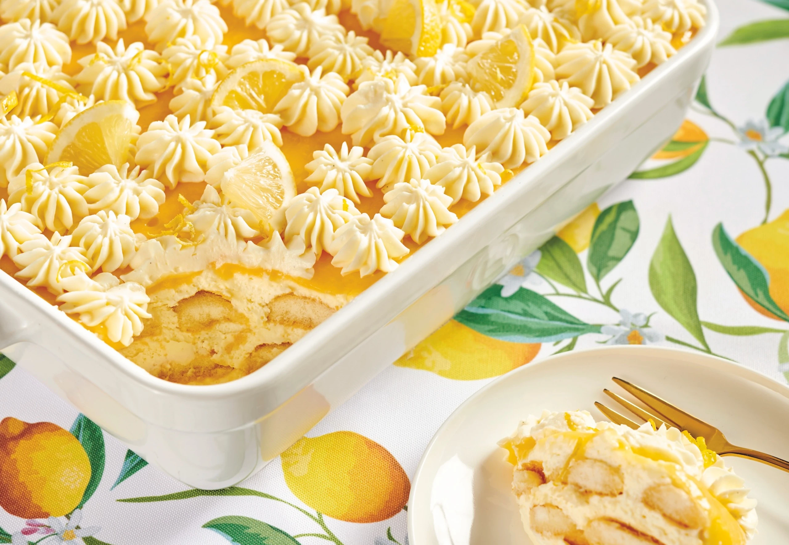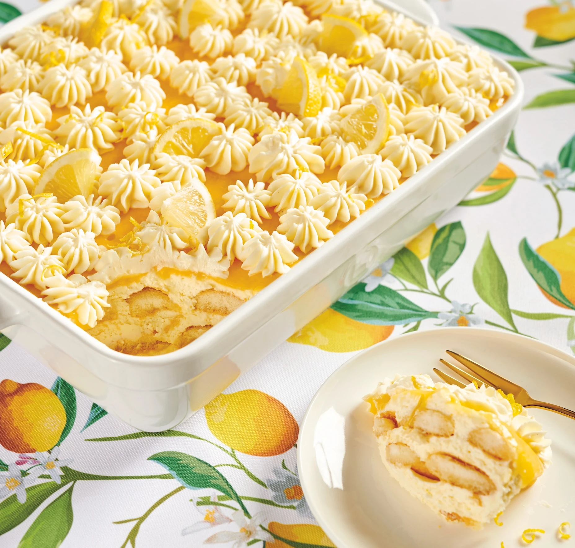 Tiramisu mit Lemon Curd bestreichen und mit der Creme im Dressiersack verzieren. Tiramisu abdecken und über Nacht kühl stellen.