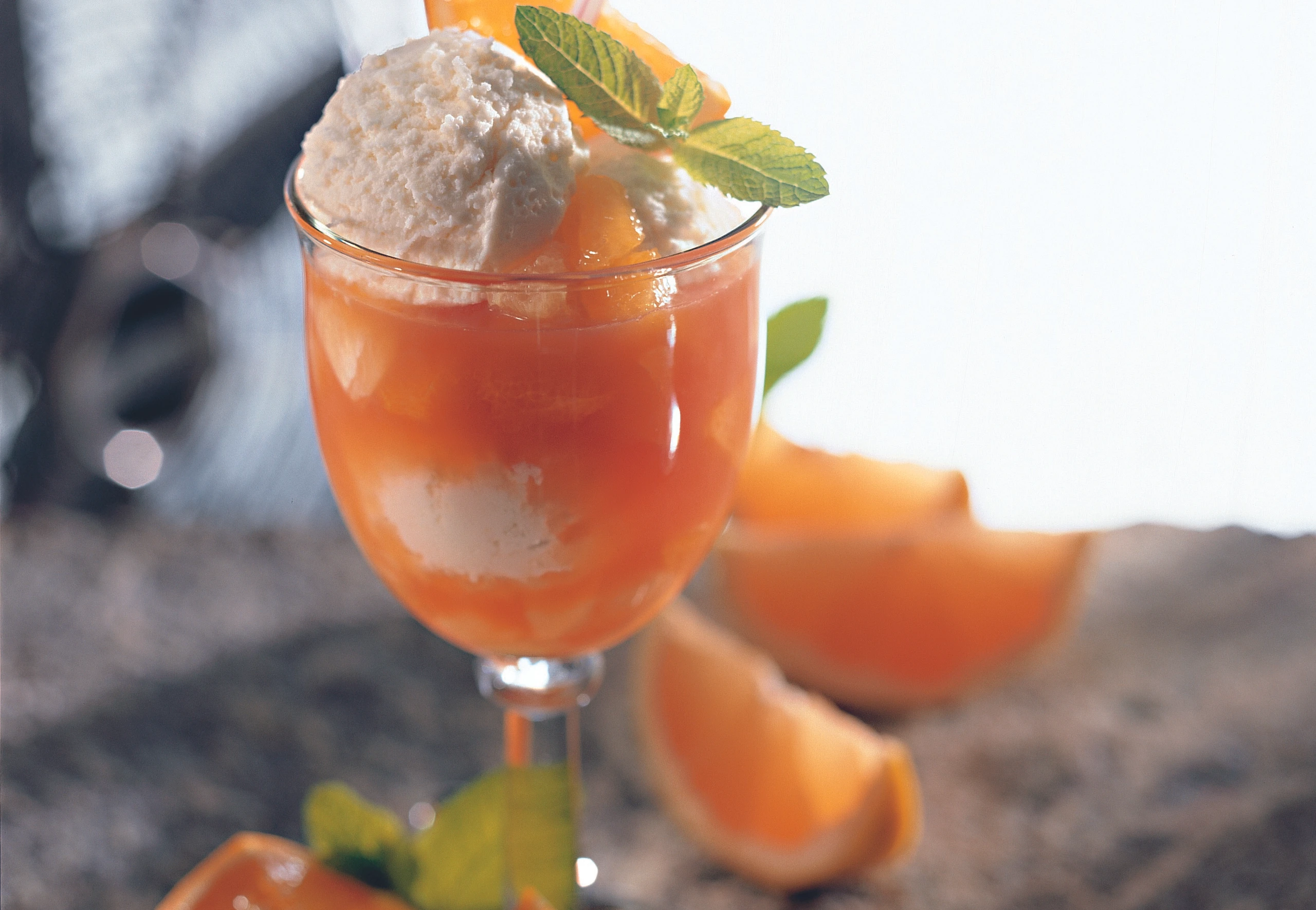 Fruchtstücke und Eiskugeln in Gläsern verteilen und mit der gekühlten Saftmischung übergießen. Cocktails mit den Orangenspalten und Minzeblättern garnieren und sofort servieren.