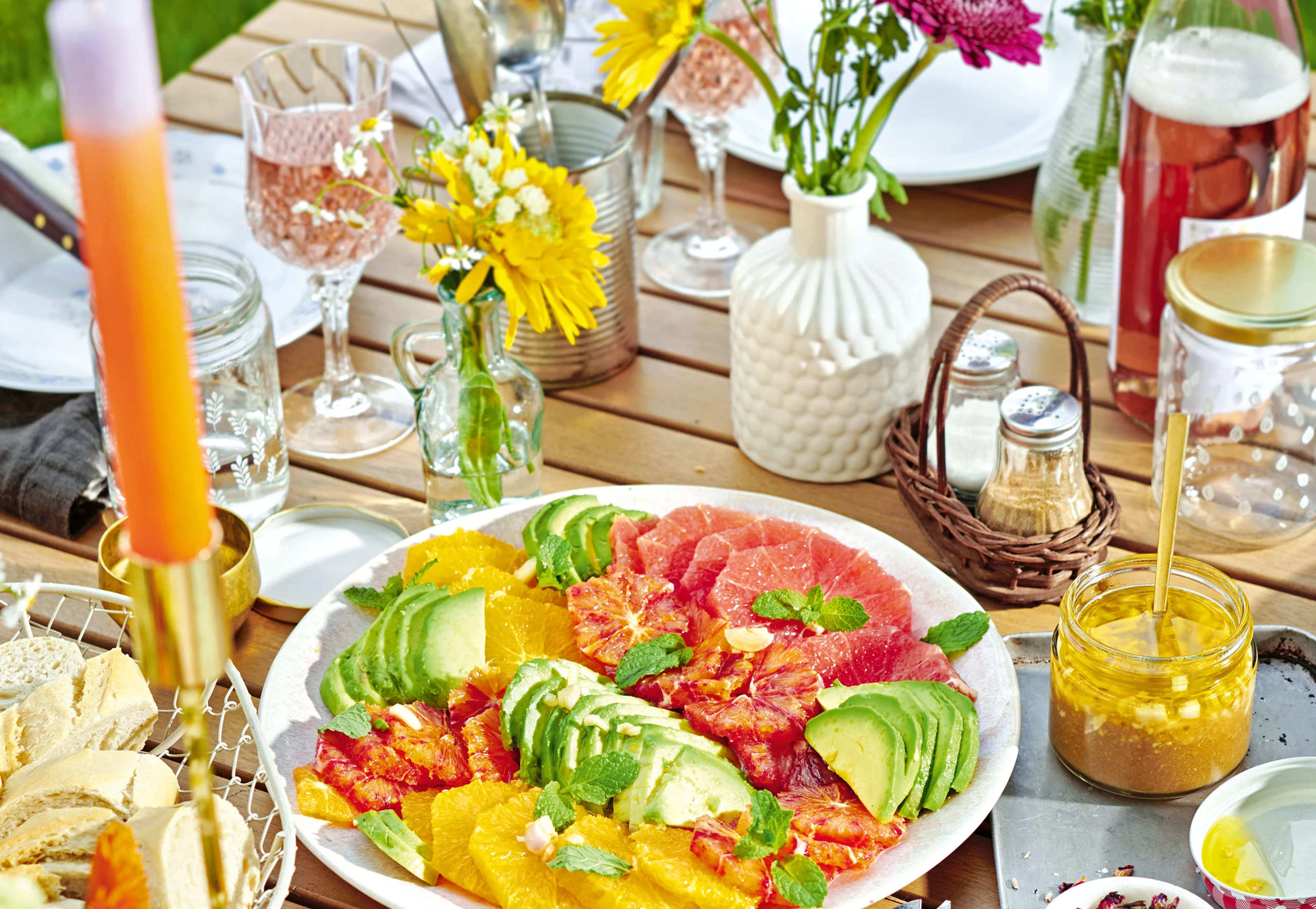 Zitrusfrüchte schälen und in Scheiben schneiden. Avocados halbieren, Kern entfernen und das Fruchtfleisch aus der Schale lösen. Avocados in Scheiben schneiden. Alles auf einer Platte anrichten, mit Vinaigrette beträufeln und mit frischer Minze garnieren.
