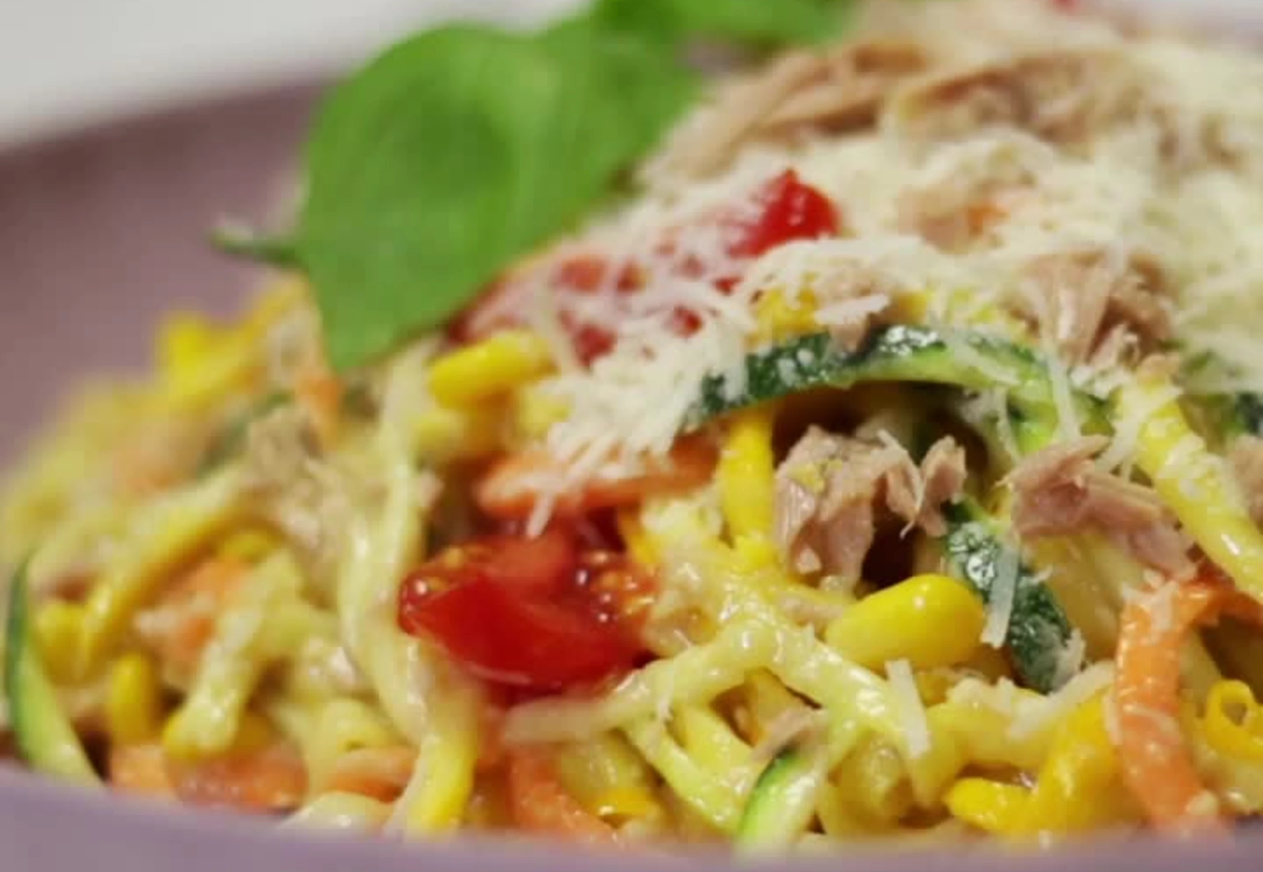 Karotten und Zucchini mit einem Spiralizer in Gemüsenudeln schneiden. Mit Dressing vermischen.