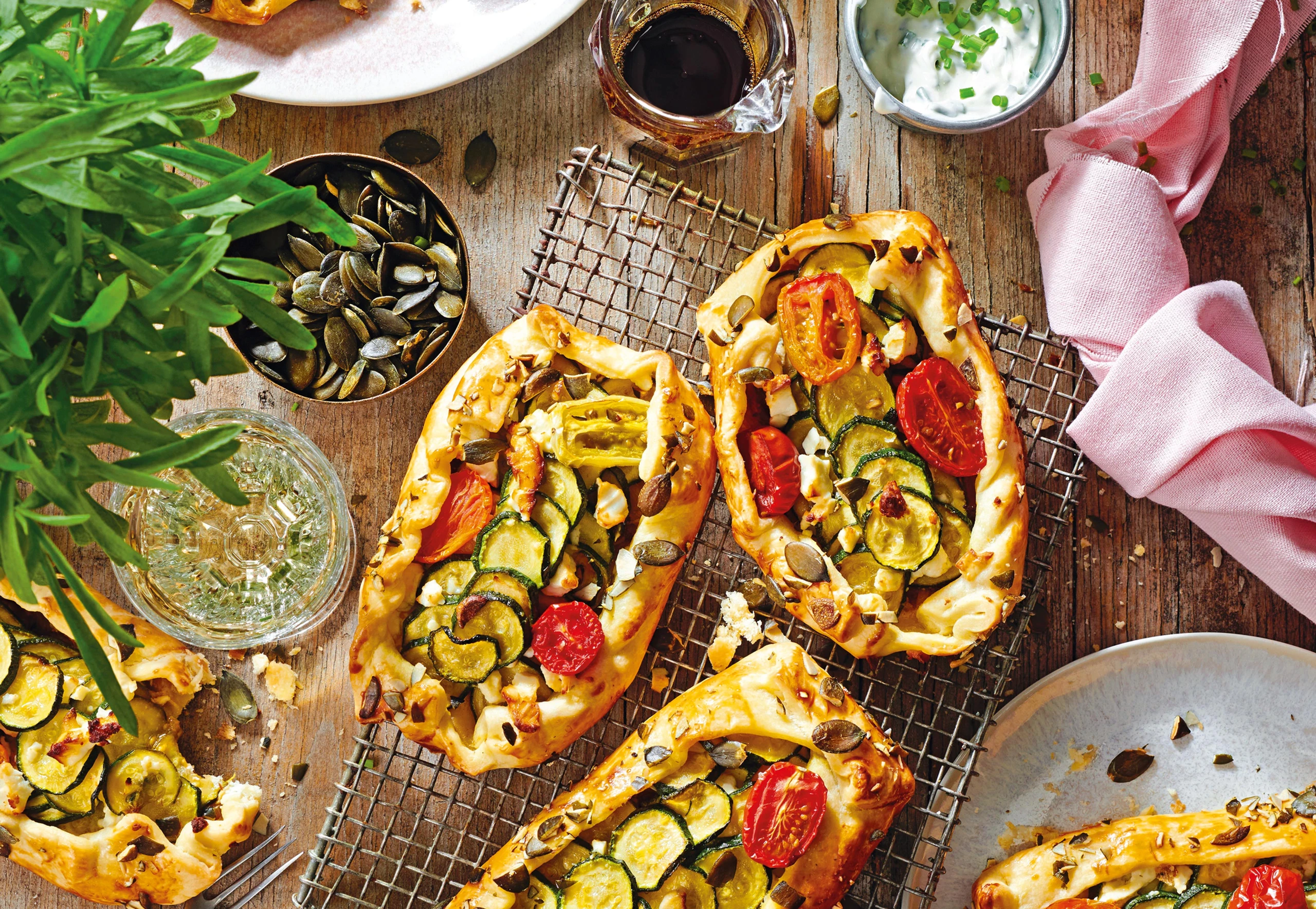Mürbteige aufrollen und in je 4 Rechtecke schneiden. Senf auf jedem Rechteck verstreichen, den Rand aussparen. Zwiebeln darauf verteilen. Mit Zucchinischeiben und Paradeisern belegen. Mit Feta bestreuen. Teigrand über die Fülle einschlagen und vorsichtig andrücken. Pies auf das Blech legen. Teigrand mit Ei bestreichen und mit Kürbiskernen bestreuen. Im Rohr (mittlere Schiene) ca. 40 Minuten backen. Herausnehmen und überkühlen lassen. Handpies mit dem Dip und Käferbohnensalat servieren.