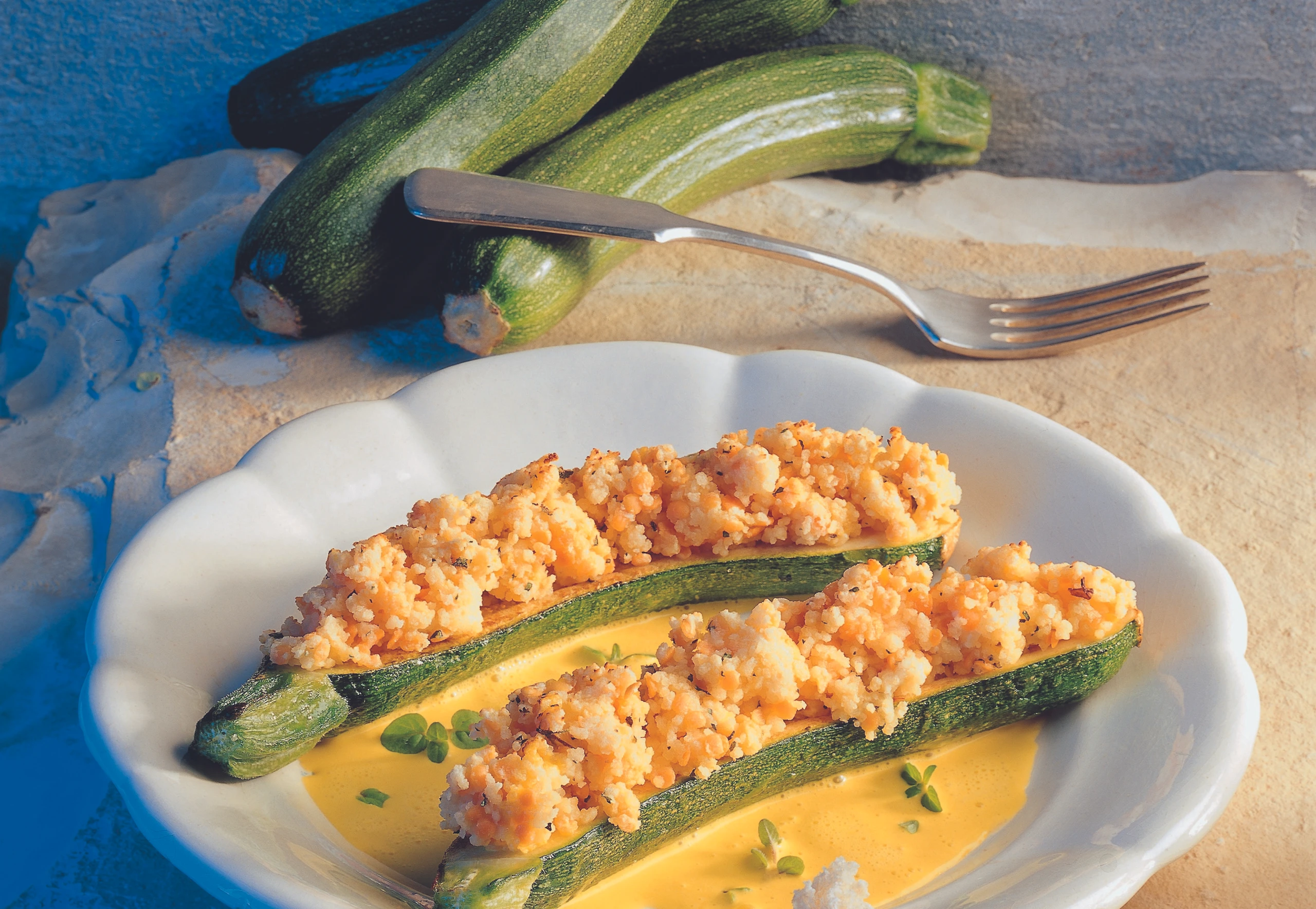 - Zucchini waschen, der Länge nach halbieren und an den Unterseiten ein wenig abflachen. Die Zucchinihälften salzen, pfeffern, mit der Couscousmasse gleichmäßig bedecken und in die Auflaufform legen. Zucchini im vorgeheizten Rohr (unterste Schiene / Gitterrost) 25-30 Minuten backen. Zucchini mit Curry-Apfelsauce servieren.