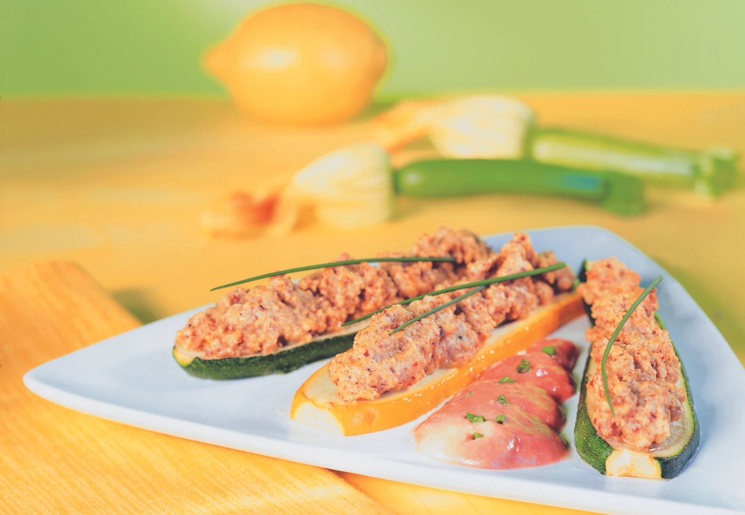 Zucchini mit Käse-Mandelkruste und rosa Schnittlauchsauce