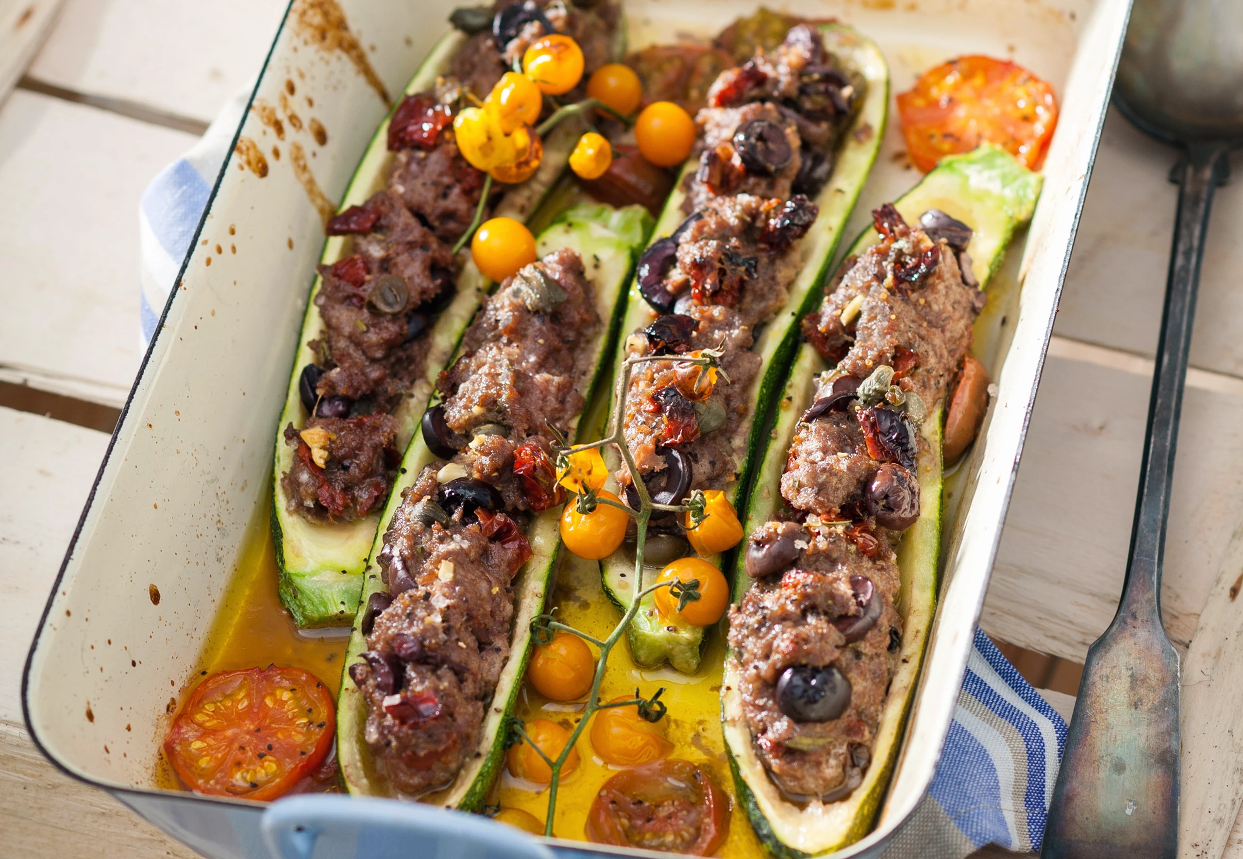 Zucchini längs halbieren und die Hälften an den Unterseiten ein wenig abflachen. Zucchinihälften mit einem Kugelausstecher (Parisienne-Ausstecher) oder einem kleinen Löffel so aushöhlen, dass rundum ein ca. 0,5 cm dicker Rand stehen bleibt.