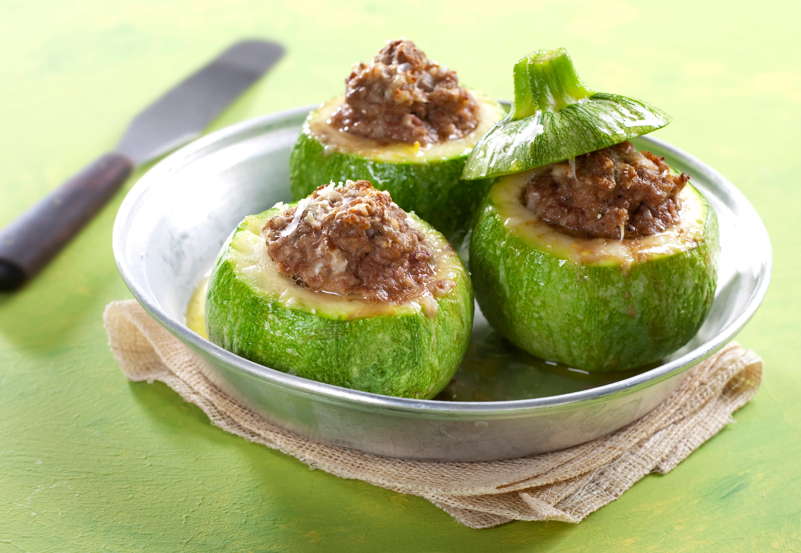 Die Kappen der Zucchini abschneiden und beiseite legen. Zucchini mit einem Kaffeelöffel so aushöhlen, dass rundum eine ca. 1,5 cm dicke Wand stehen bleibt. Ausgehöhltes Fruchtfleisch klein schneiden und für die Fülle beiseite legen.