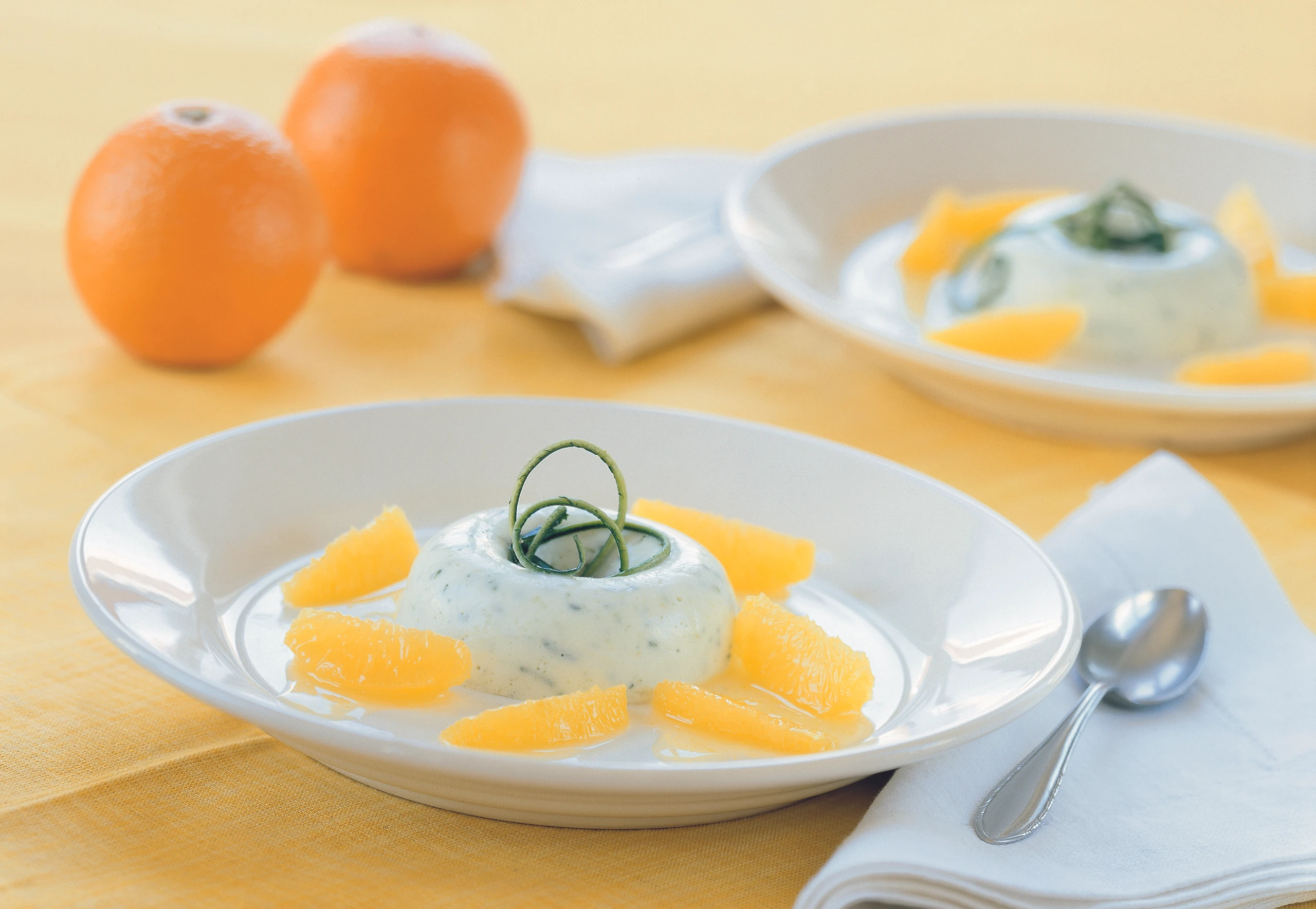 - Cremen aus den Förmchen stürzen (dafür die Förmchen kurz in heißes Wasser tauchen). Mit der Orangensauce anrichten, mit Zucchini-Zesten garnieren.