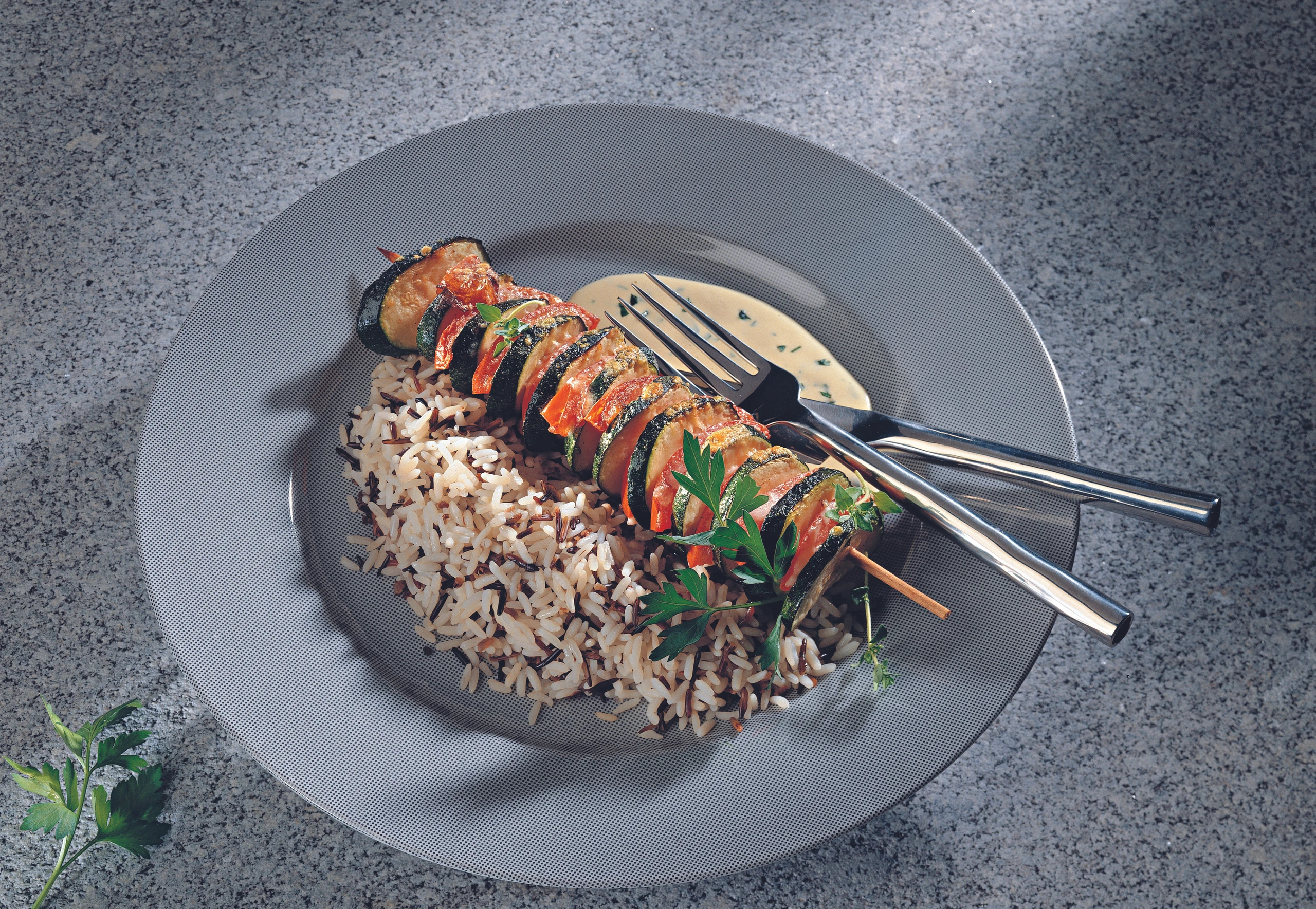 - Die Zucchini-Paradeiser-Spieße mit Petersilblättchen garnieren, mit Reis und Sauce anrichten.