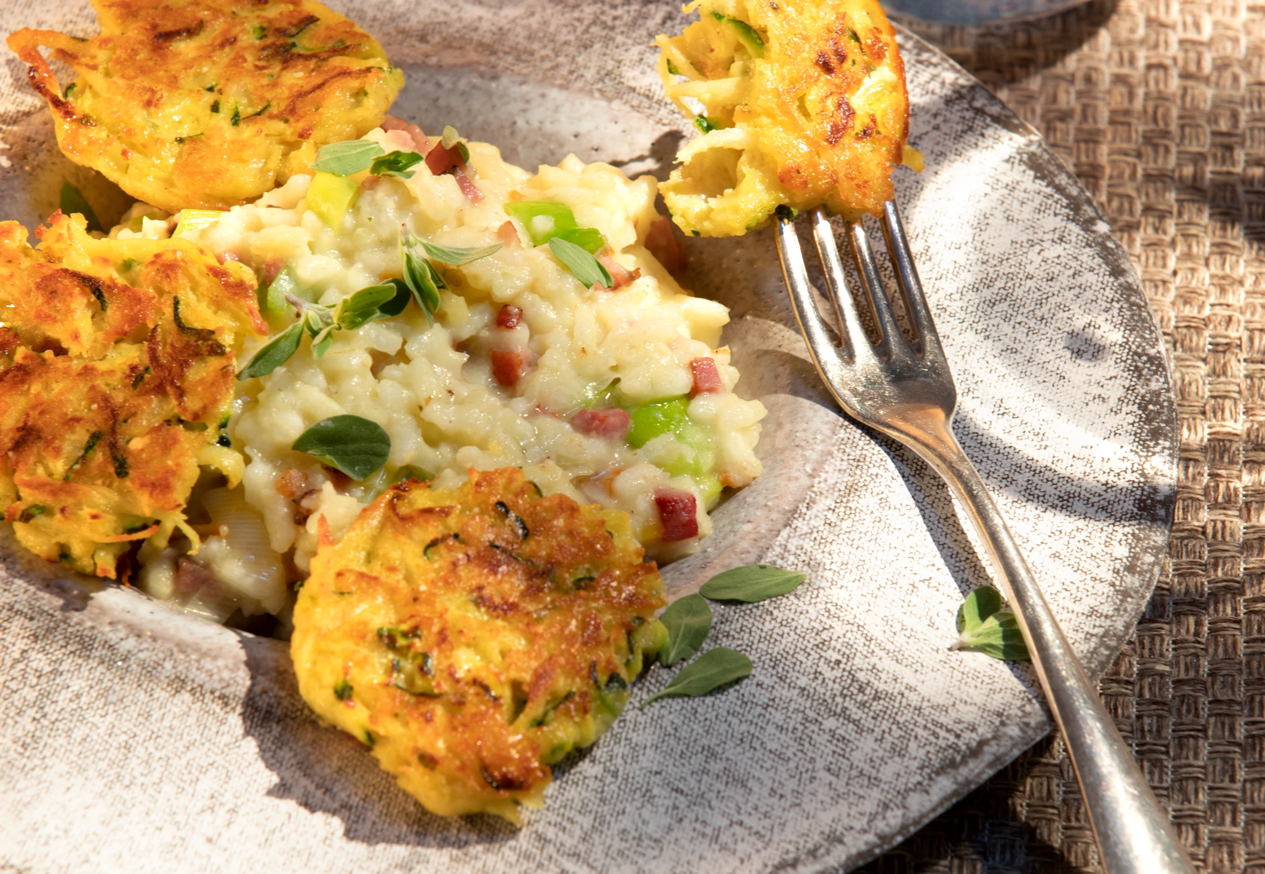 Zucchini-Parmesanlaibchen auf Speckrisotto