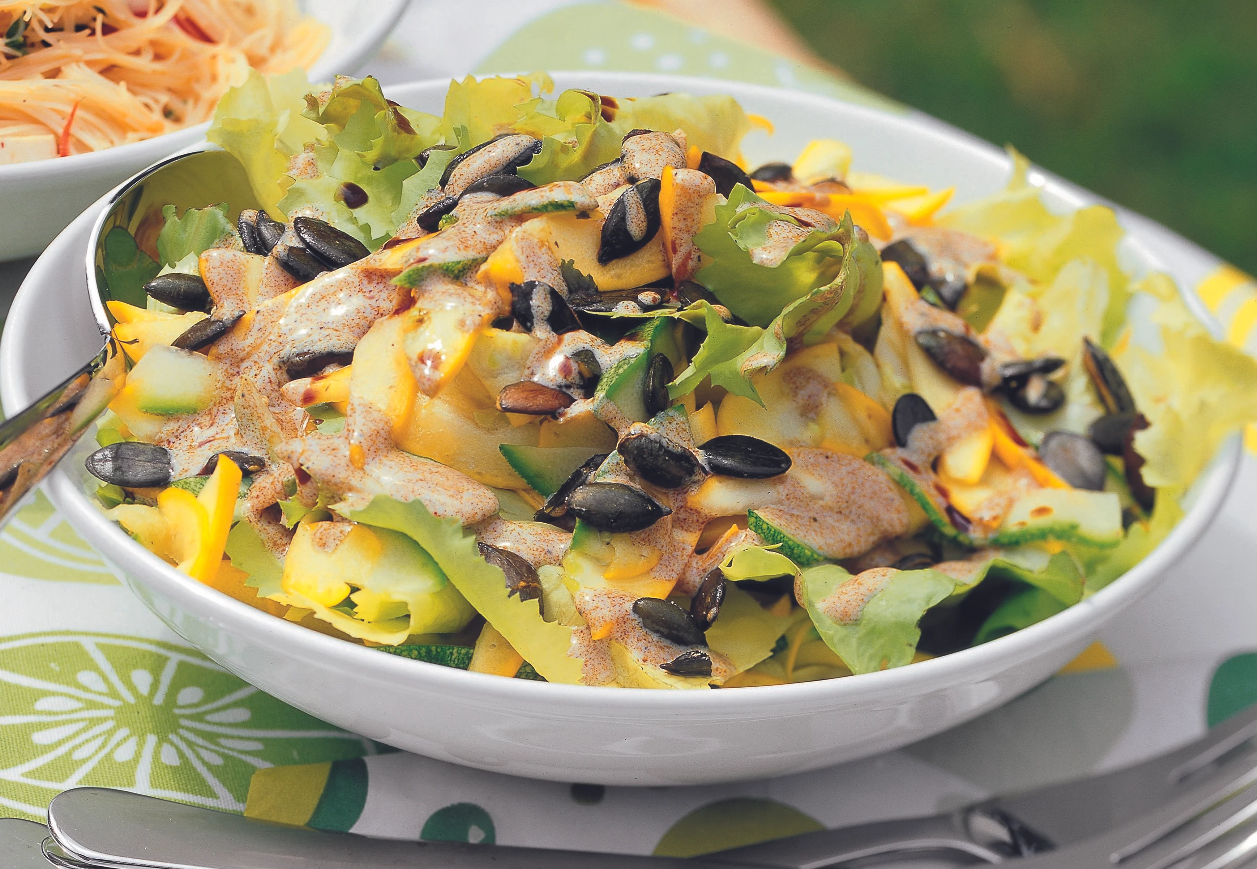 Joghurt mit Kürbiskernöl, Dijonsenf und Knoblauch verrühren. Endiviensalat und Zucchini damit marinieren, Kürbiskerne darüber streuen.