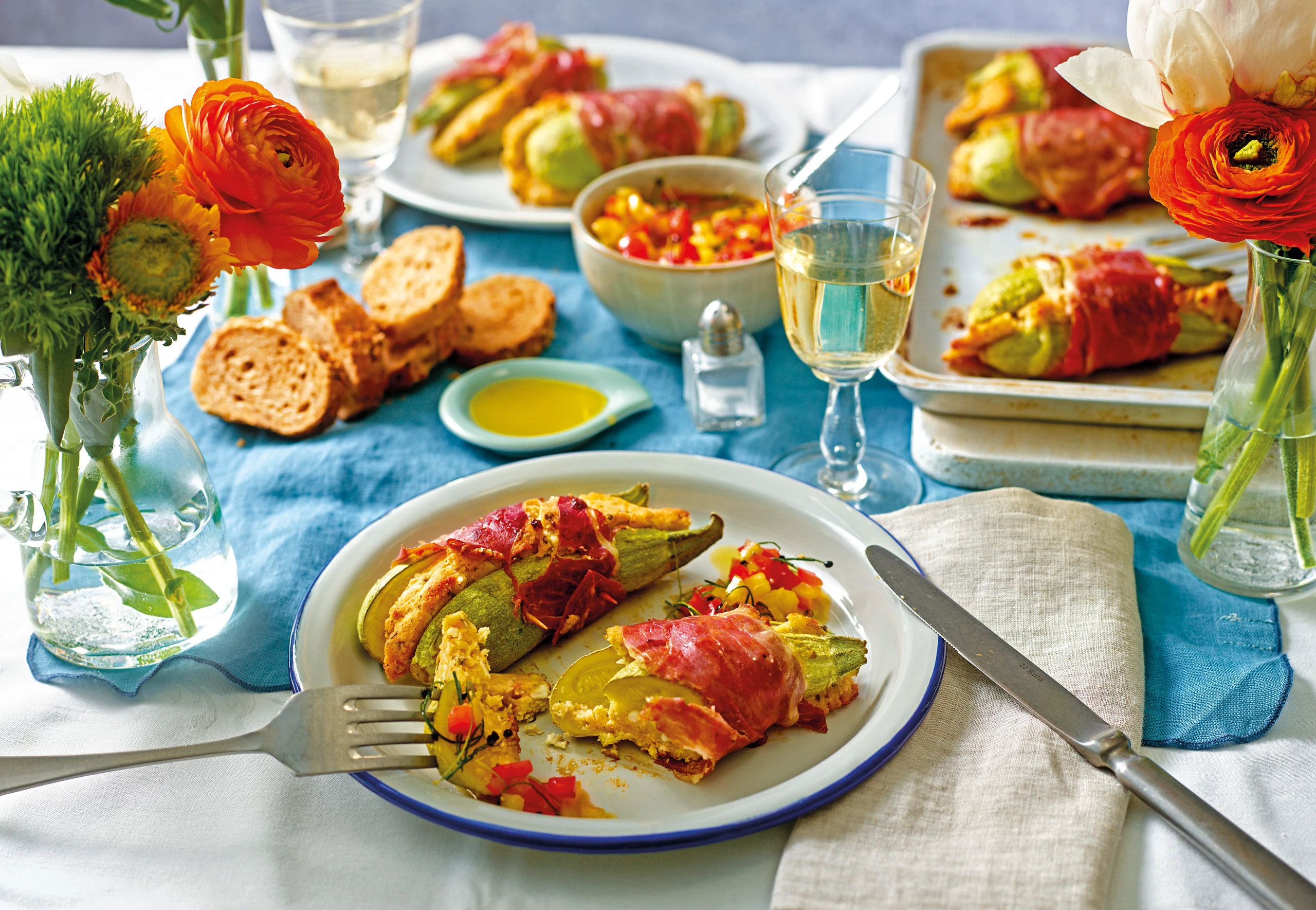 Rohr auf 200 °C Ober-/Unterhitze vorheizen. Ein Backblech mit Backpapier belegen. Zucchini längs halbieren. Auf jeweils einer Hälfte die Fülle verteilen, mit den übrigen Hälften zusammensetzen. Öl und Knoblauch gut verrühren und mit Salz und Pfeffer würzen. Zucchini mit je 2 Scheiben Prosciutto umwickeln, mit Zahnstochern fixieren, auf das Backblech setzen und mit der Ölmischung bestreichen. Zucchini im Rohr (mittlere Schiene) ca. 25 Minuten backen.