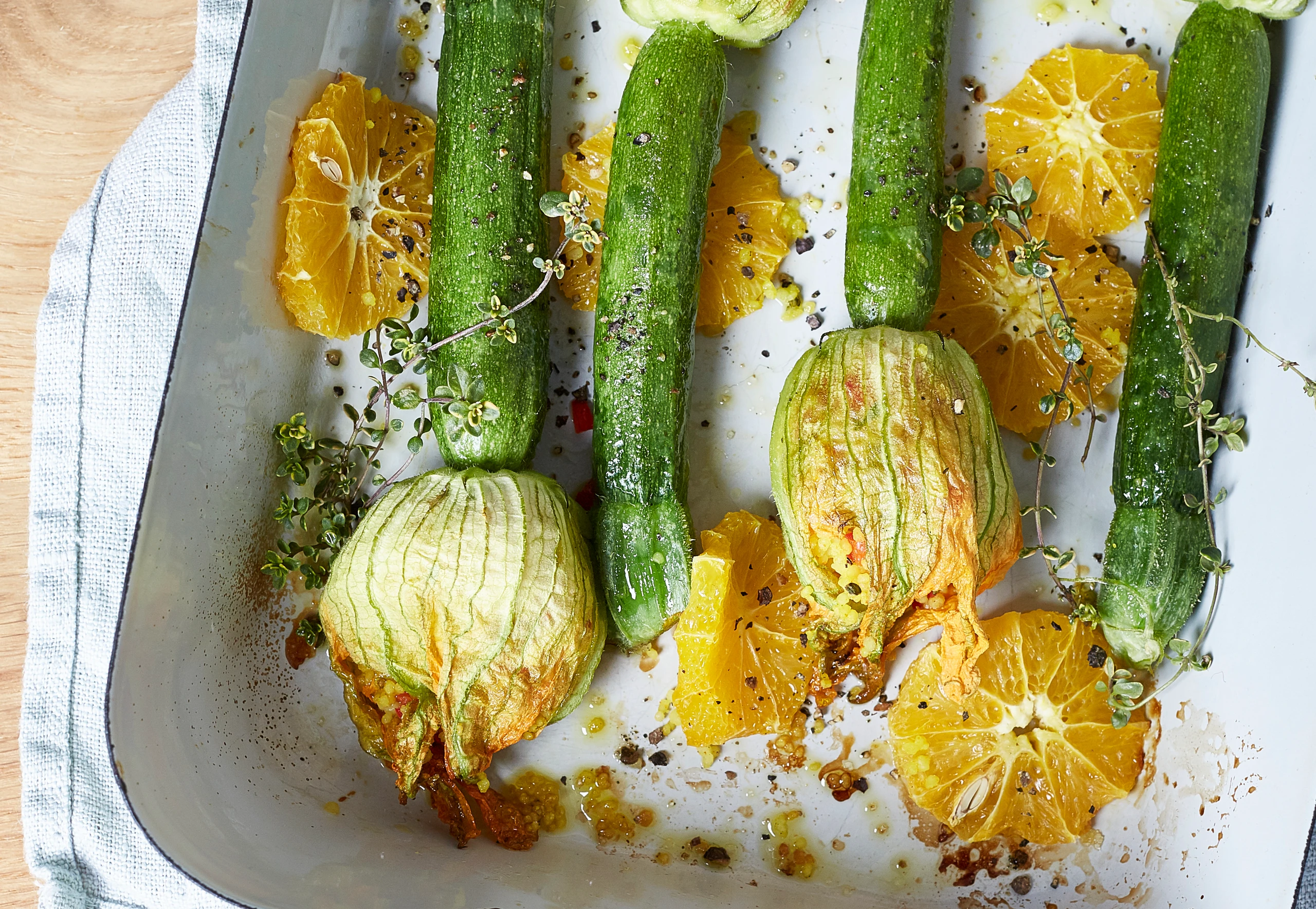 Zucchiniblüten behutsam öffnen und den Blütenkelch (Stempel) entfernen. Couscous in die Blüten füllen und diese an den Enden eindrehen. Zucchiniblüten auf die Orangenscheiben legen, salzen, pfeffern, mit übrigem Thymian bestreuen und mit 2 EL Olivenöl beträufeln. Zucchiniblüten im Rohr (mittlere Schiene / Gitterrost) ca. 20 Minuten garen.
