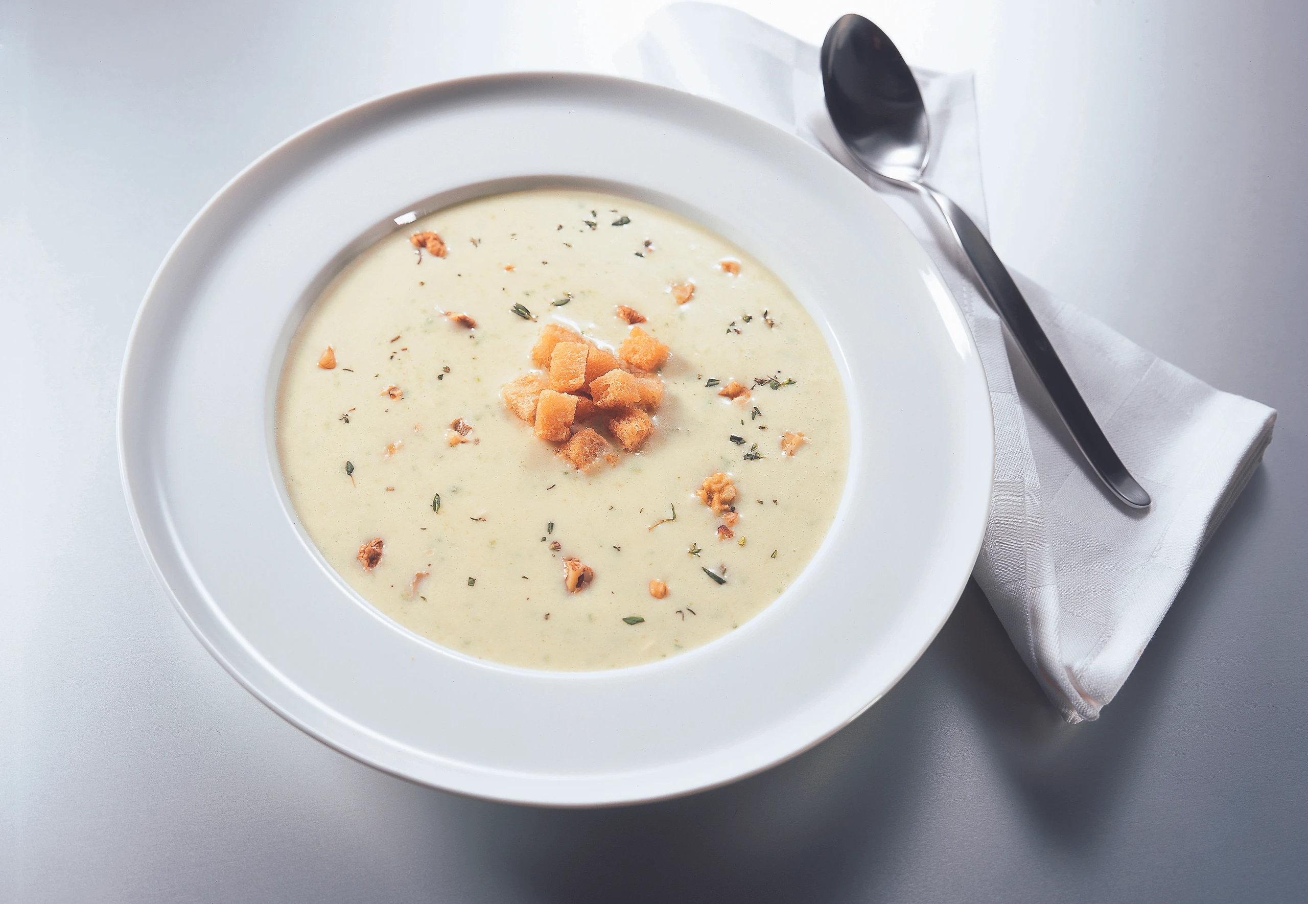 Inzwischen für die Einlage Zucchini grob raspeln, in ein Tuch einschlagen und behutsam ausdrücken. Toastbrot entrinden und in ca. 1/2 cm große Stücke schneiden. Brotstücke in heißem Öl goldgelb backen, dabei öfter schwenken. Herausheben und auf Küchenpapier abtropfen lassen.