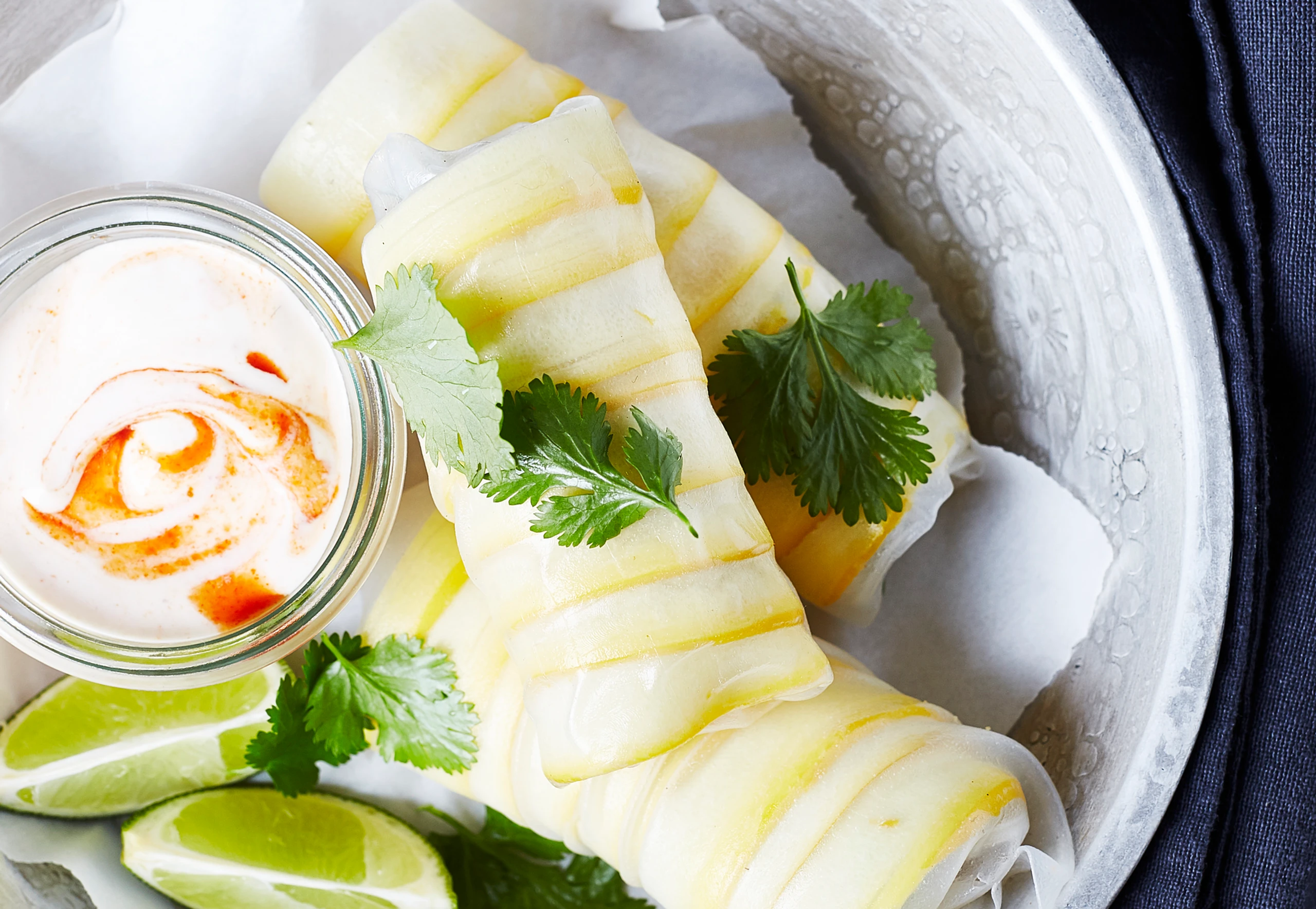 Zucchiniröllchen mit Tofu und Sriracha-Dip