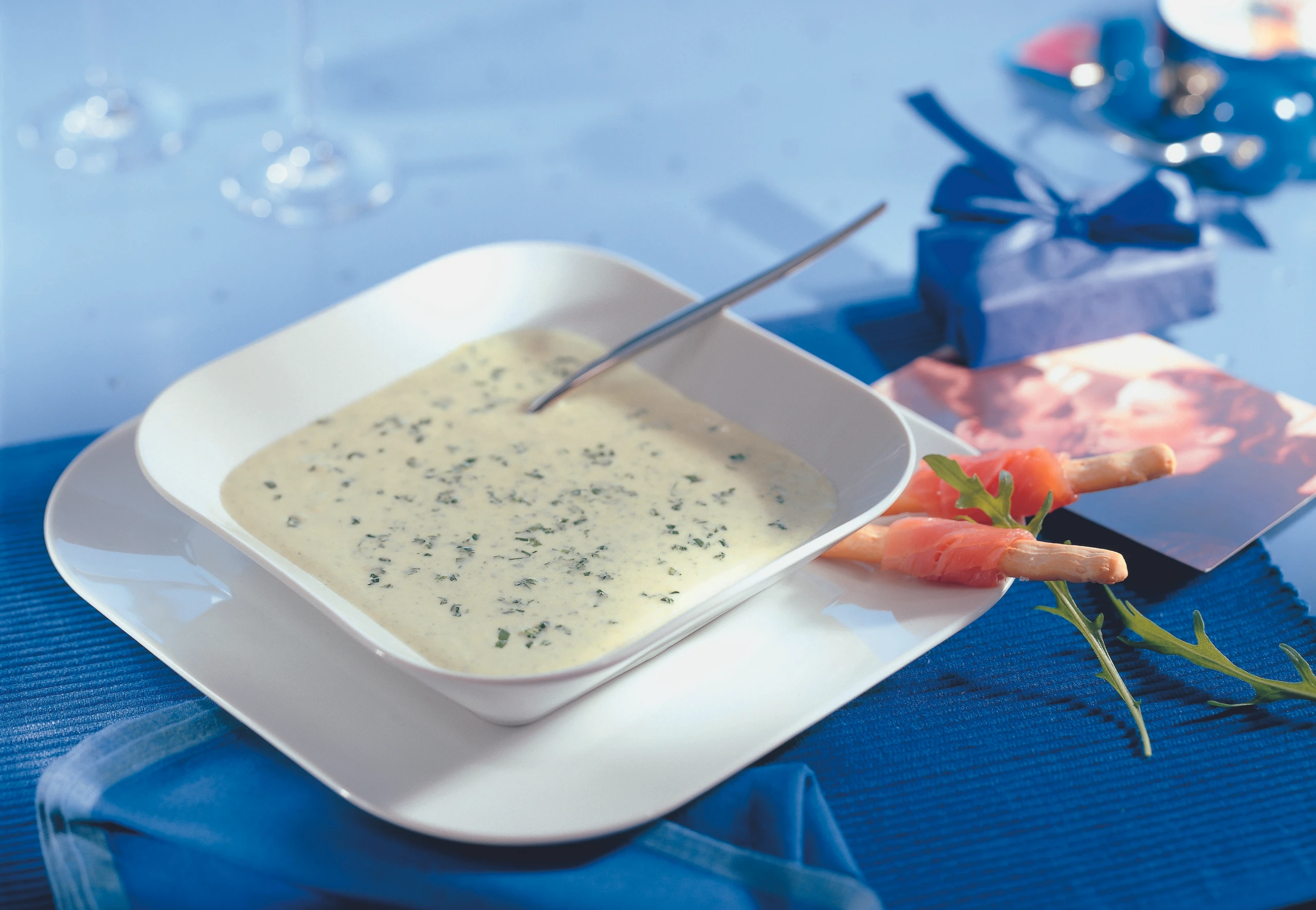 Zucchinisuppe mit Rucola und Lachs-Grissini