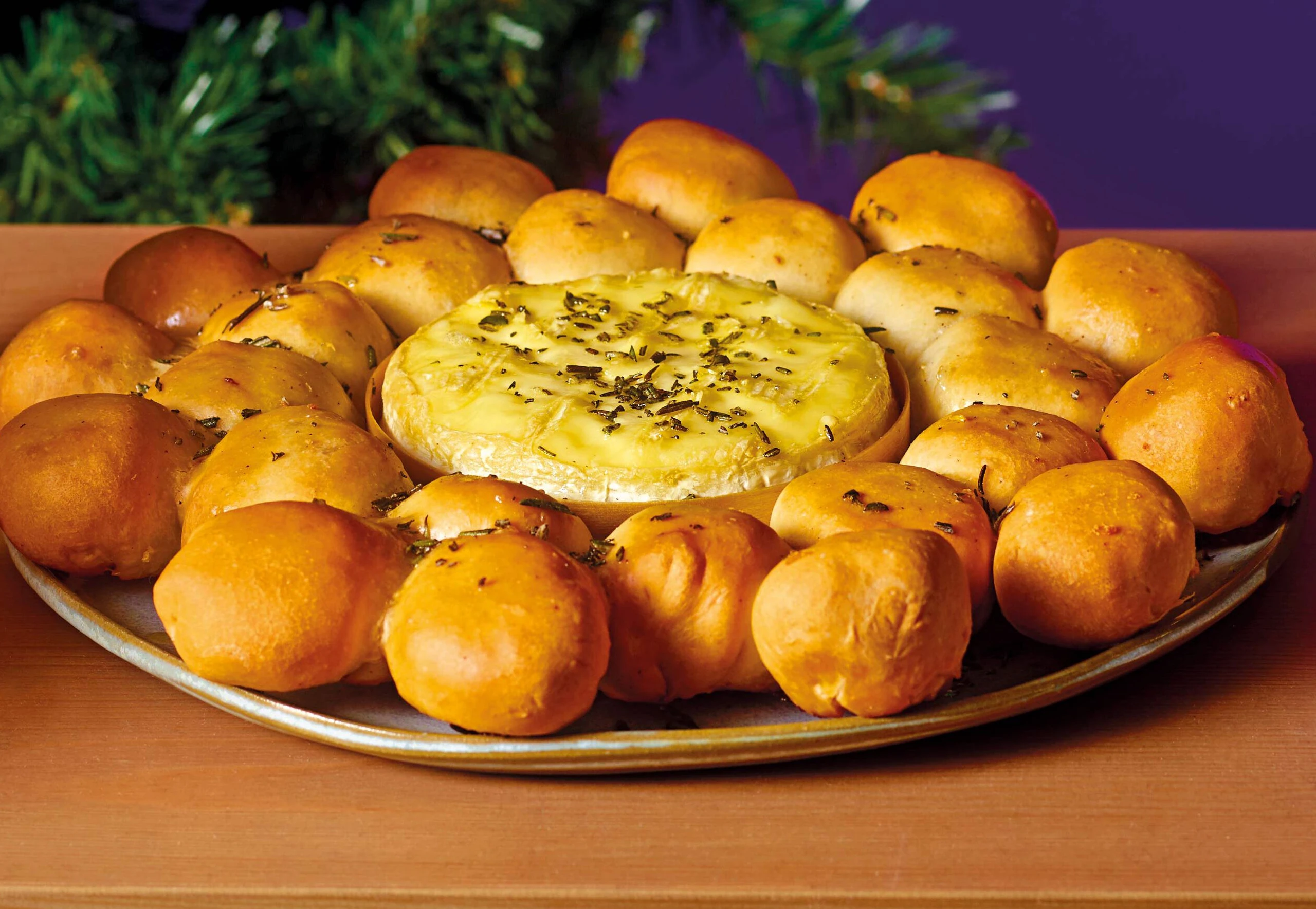 Knoblauch schälen und pressen. Mit Butter und Rosmarin vermischen. Bällchen und Camembert mit der Kräuter-Knoblauch-Butter bestreichen.