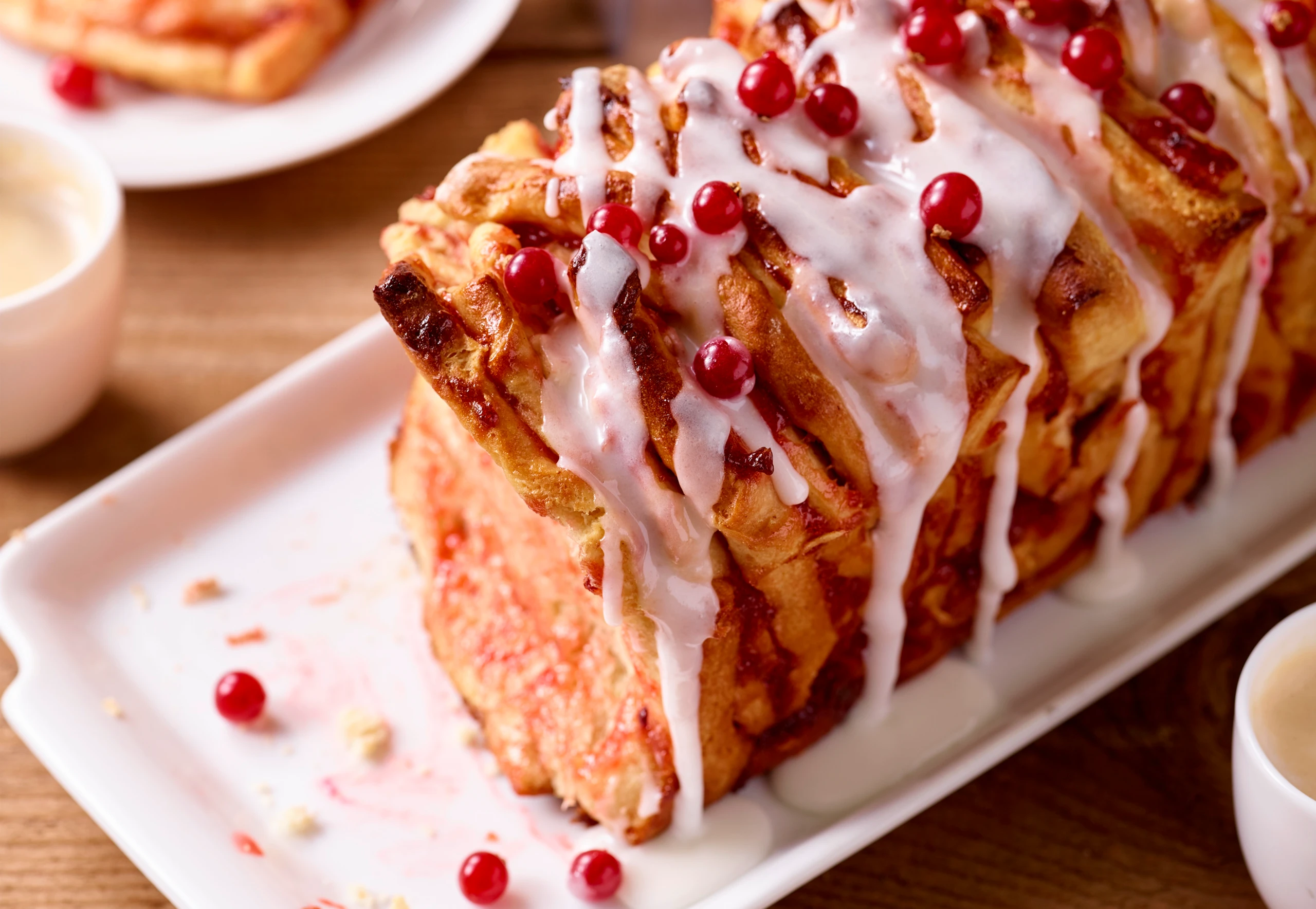 Für die Glasur Staubzucker mit Zitronensaft verrühren. Brot aus der Form stürzen, mit der Glasur beträufeln und mit den Ribiseln dekorieren.