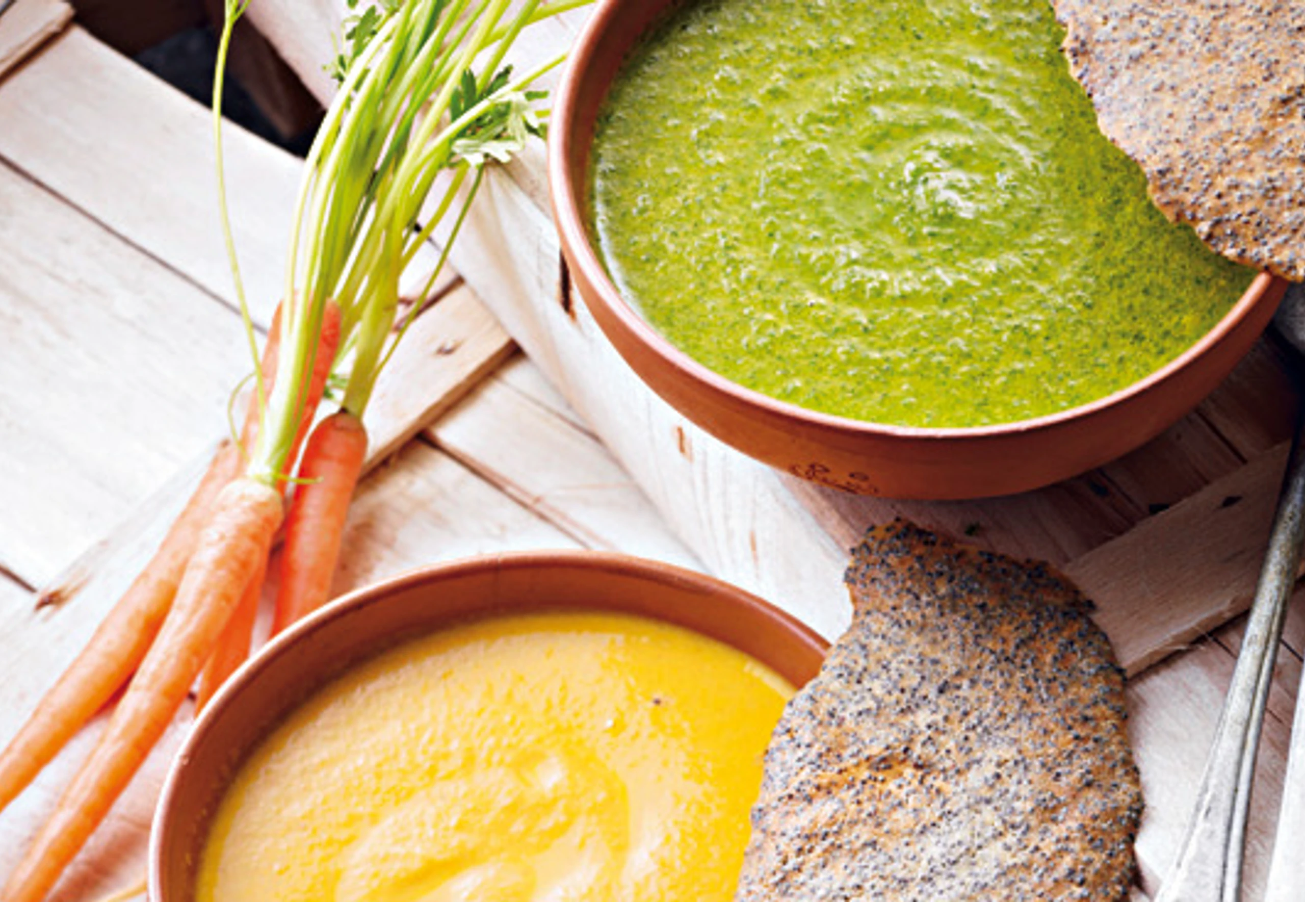 - Karottengrün 1 Minute in Wasser überkochen, kalt abschrecken, ausdrücken und fein schneiden. Grün mit der Hälfte der Karottensuppe fein pürieren, restliche Suppe ebenfalls pürieren. Suppen salzen und anrichten.