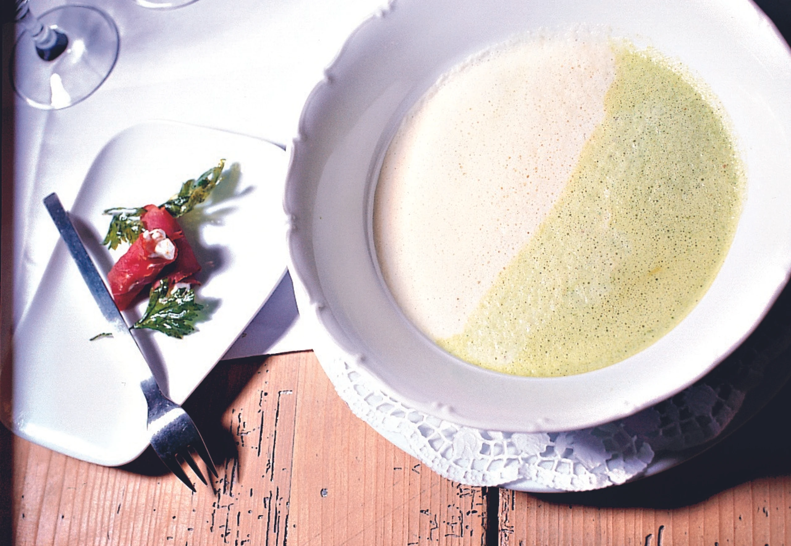 Suppen unmittelbar vor dem Servieren aufschäumen. Beide Suppen gleichzeitig langsam in Teller gießen, so bleiben sie farblich getrennt.