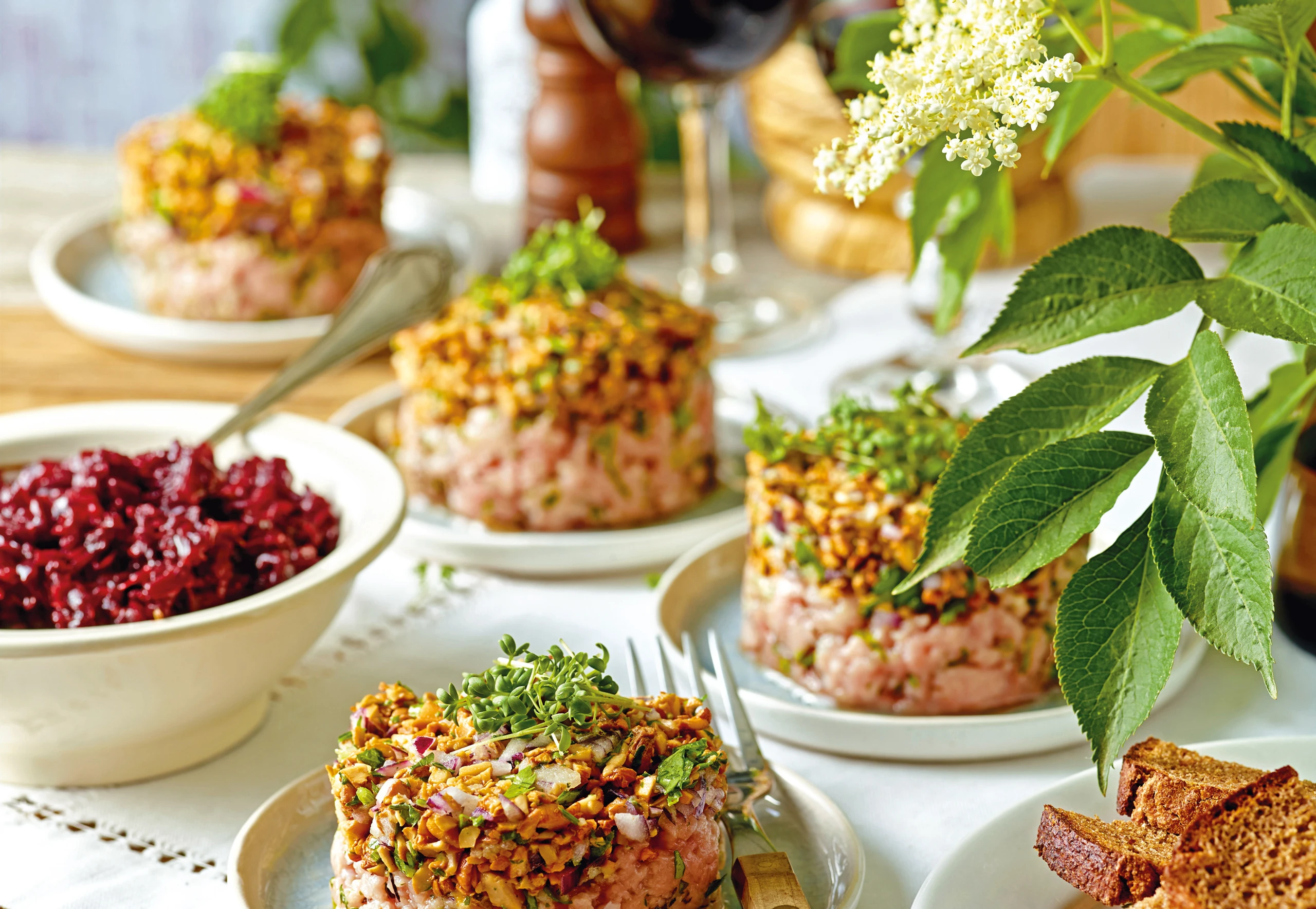 Eierschwammerl & Kalb: Zweierlei Tatar mit Portweinzwiebeln
