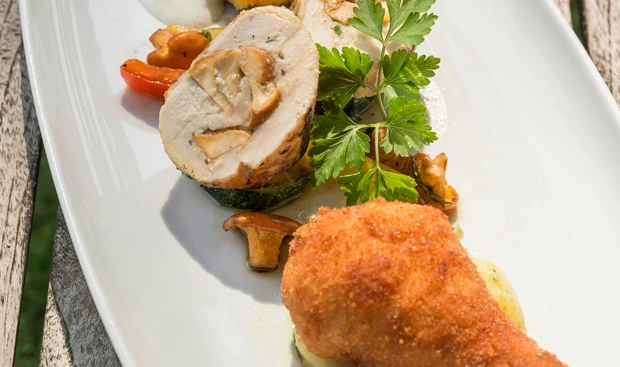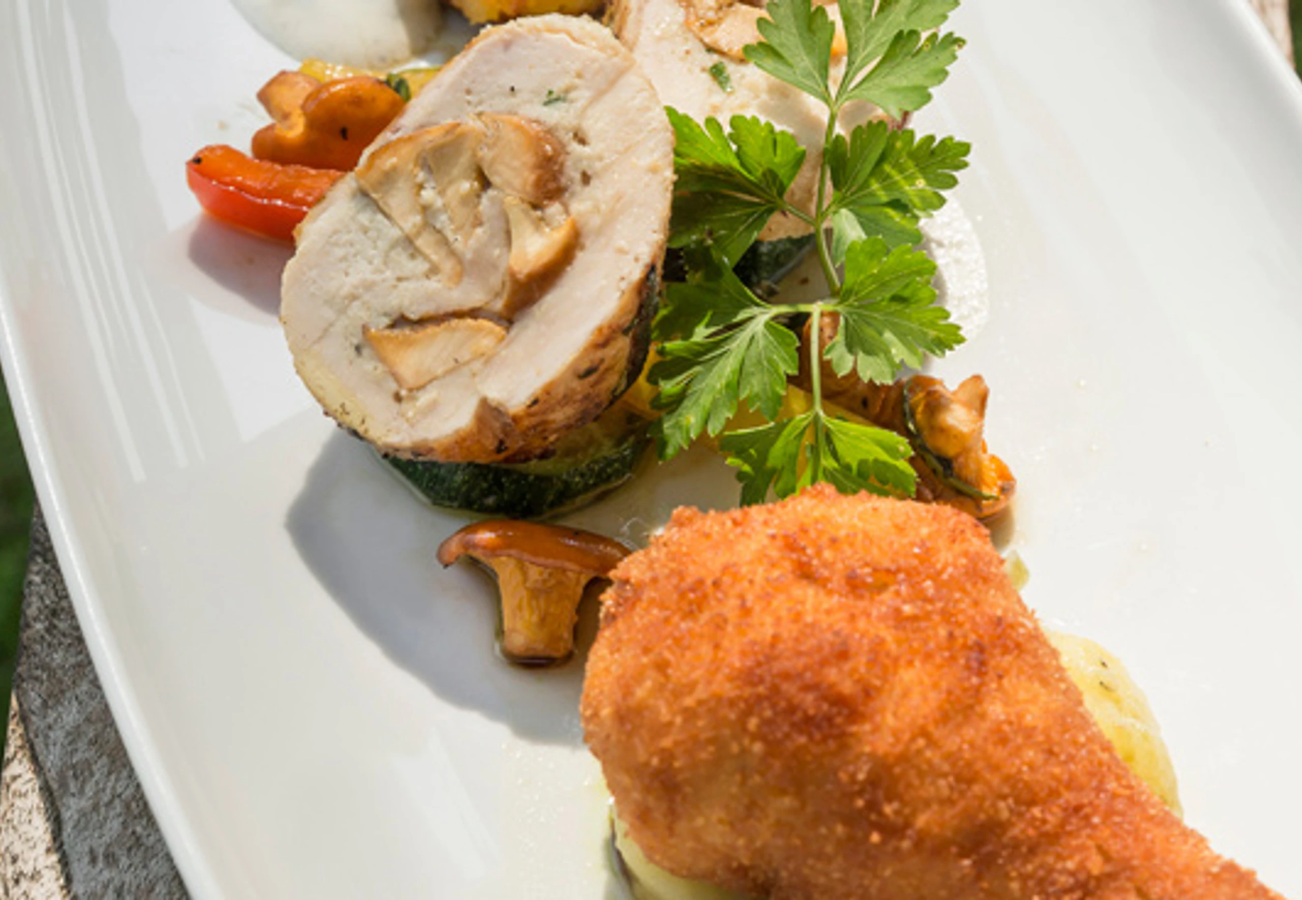 - Ca. 3 Finger hoch Öl erhitzen, Keulen darin backen. Herausheben und auf Küchenpapier abtropfen lassen. Röllchen aufschneiden, mit Keulen und Gemüse anrichten. Zu den Röllchen serviert man gebratene Polentaschnitten und Kräuterrahm, zu den Keulen Erdäpfelsalat.