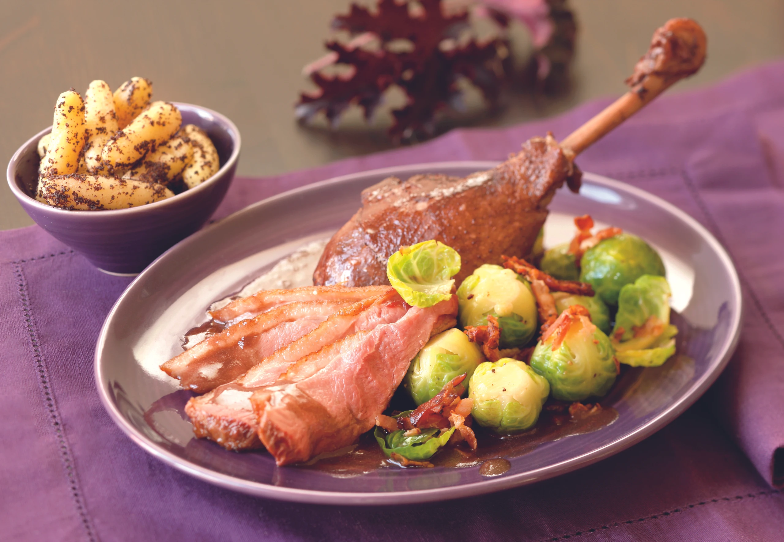Keulen aus der Sauce heben und im Gelenk durchschneiden. Sauce und abgetropften Saft vermischen und ein wenig einkochen. Brüste aus dem Rohr nehmen und in Scheiben schneiden, mit Keulen, Sauce, Mohnnudeln und Kohlsprossen anrichten.