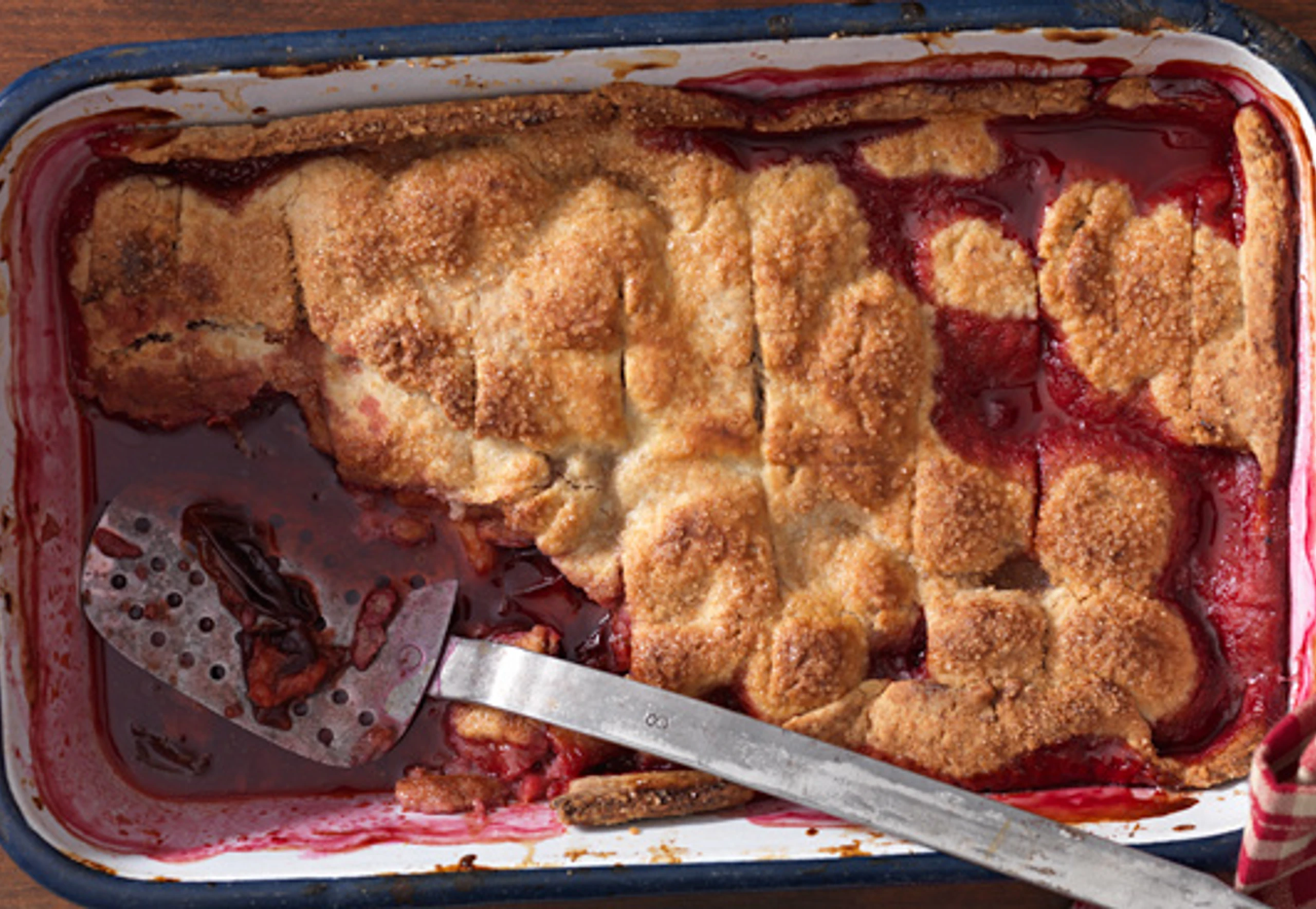 Teig auf einer leicht bemehlten Arbeitsfläche ca. 3 mm dick ausrollen, locker auf die Früchte legen und mit einem kleinen Messer in kurzen Abständen einschneiden. Teig mit übriger Buttermilch bestreichen und mit etwas Braunzucker bestreuen. Crumble im Rohr (mittlere Schiene / Gitterrost) ca. 20 Minuten backen.